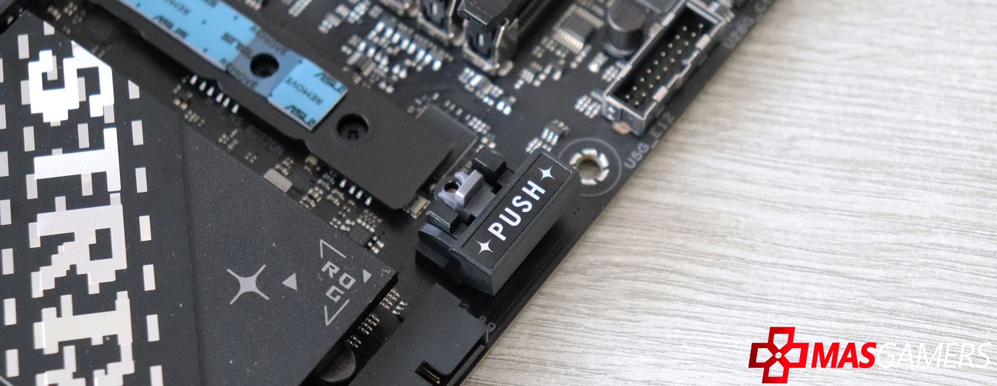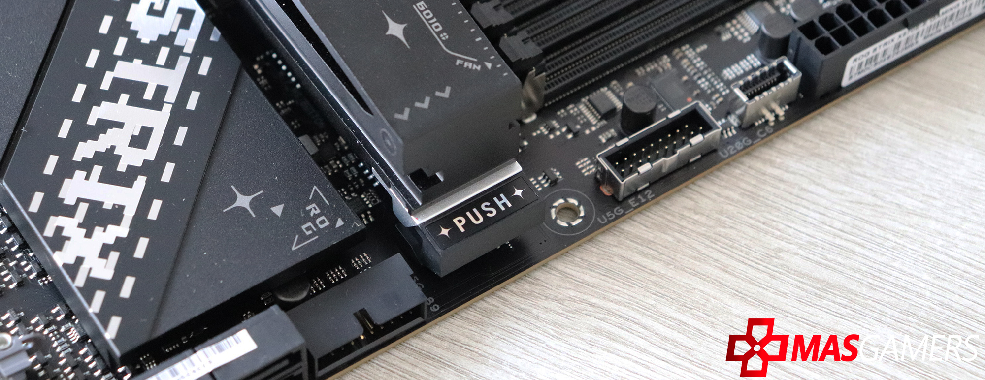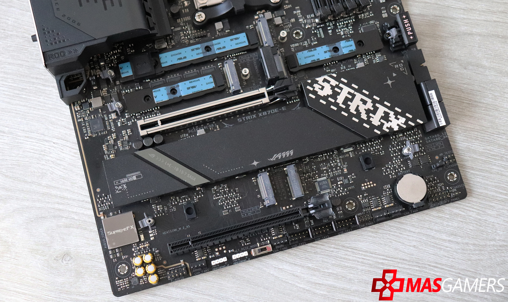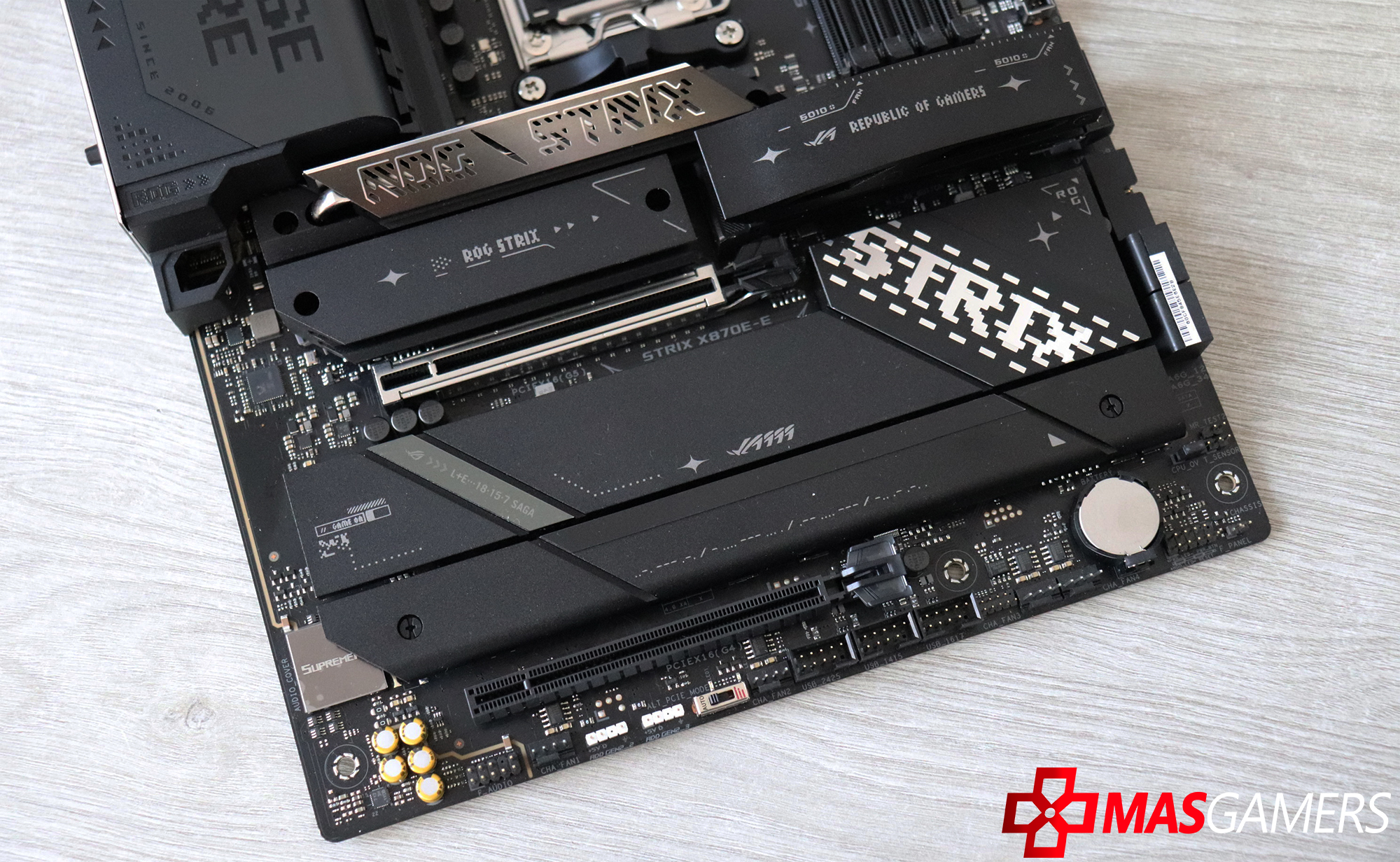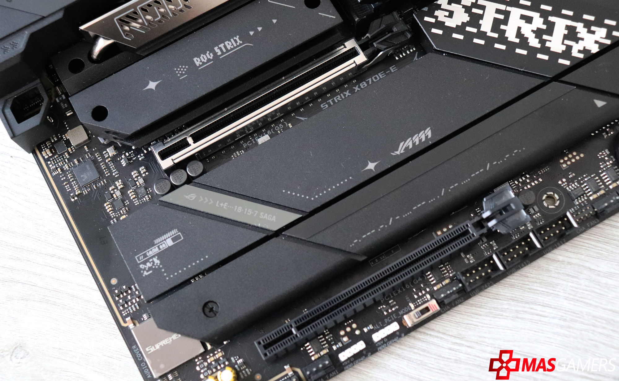 En cuantos a las unidades M.2 es donde empezamos a ver como se trata de un modelo tope de gama. Esto se nota al ver todos estos puestos cuentan con disipador y en especial los que tienen soporte para unidades PCIe 5.0.