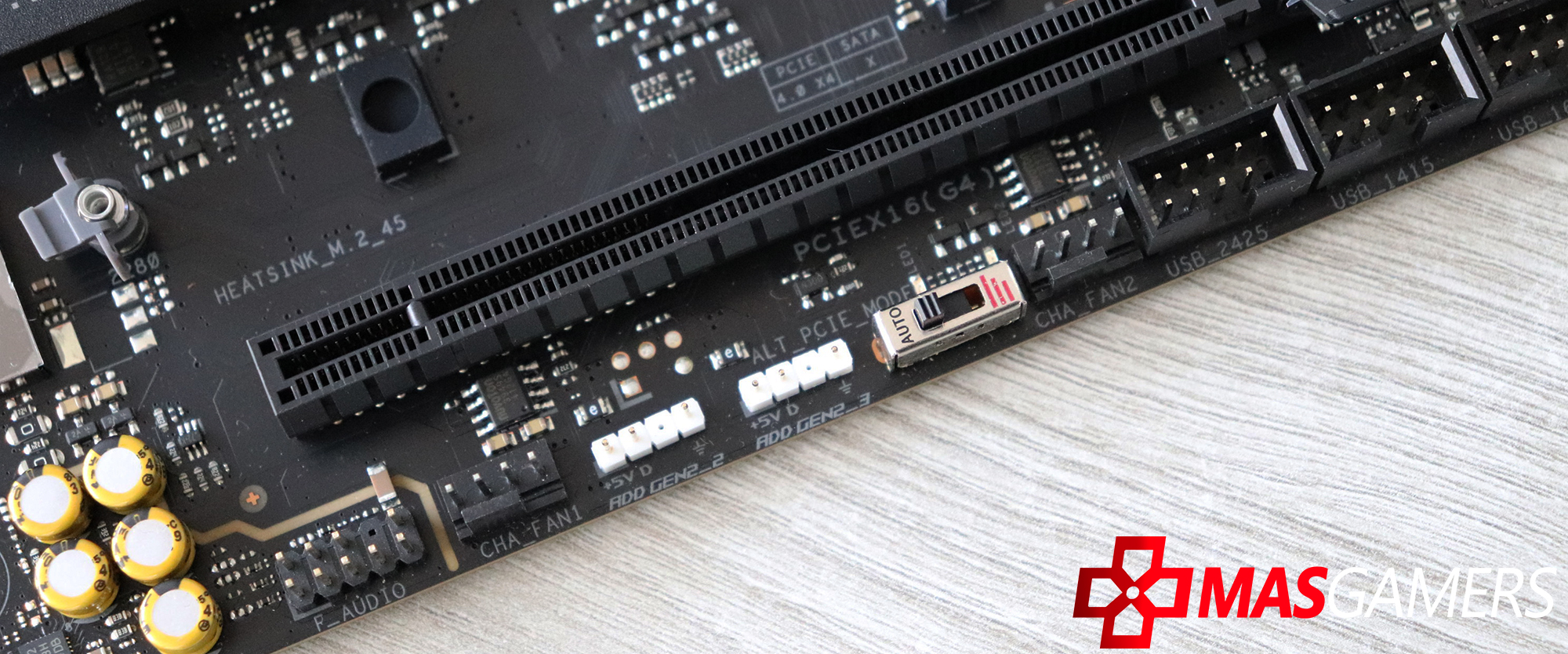 También como dato interesante, es que en la base encontramos 2 conectores ARGB ADD_Gen2_2 para poder conectar todos los dispositivos de iluminación que veamos convenientes. También en esta zona encontramos el switch que nos permite cambiar entre las distintas versiones de PCIe para evitar problemas de compatibilidad.