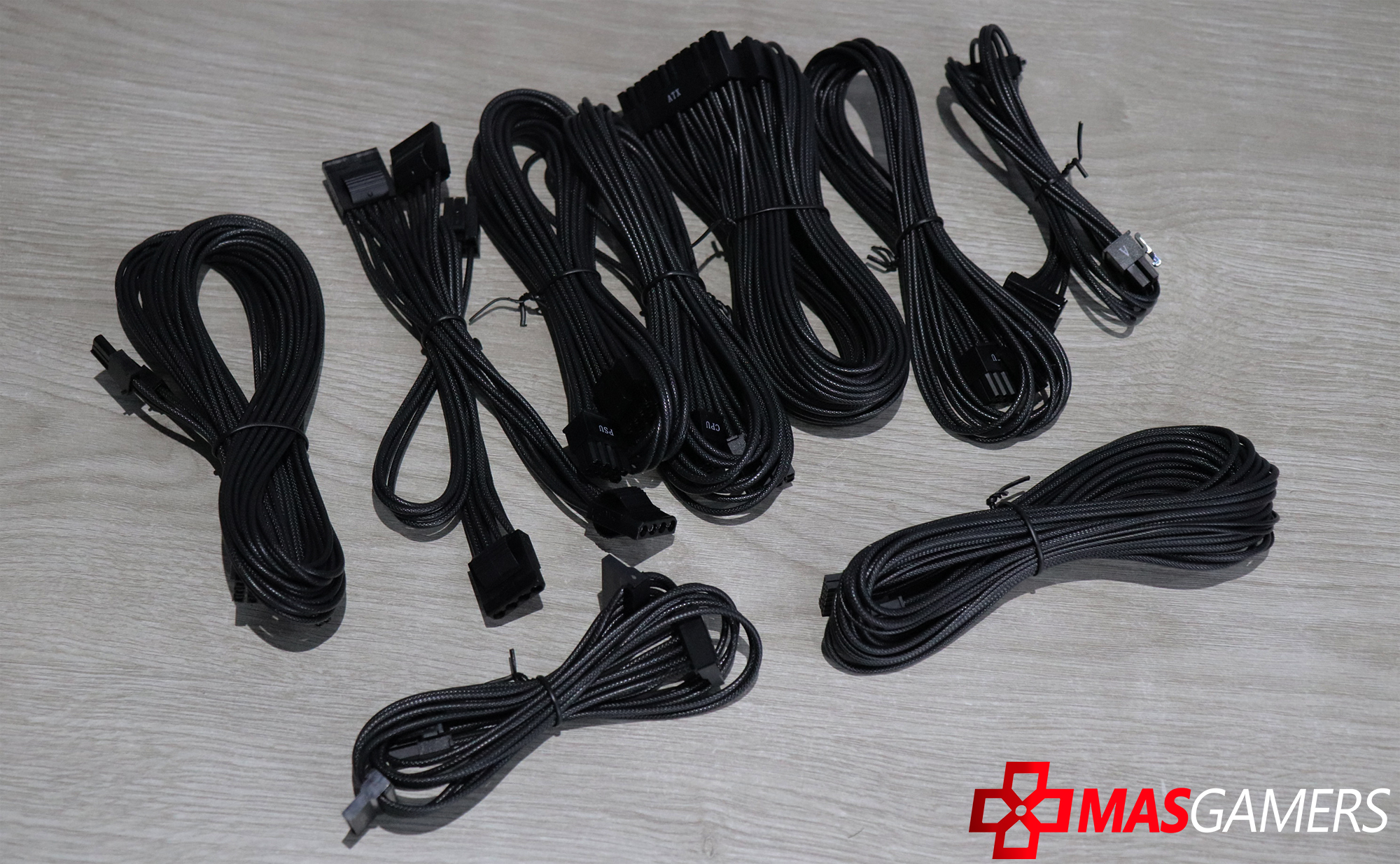 En la parte trasera, donde se conectan los cables, presenta un diseño completamente modular, lo que significa que todos los cables son desmontables. Los puertos están bien organizados y etiquetados, facilitando la conexión de los diferentes componentes del sistema. Los conectores modulares son de color negro, manteniendo la uniformidad del diseño.