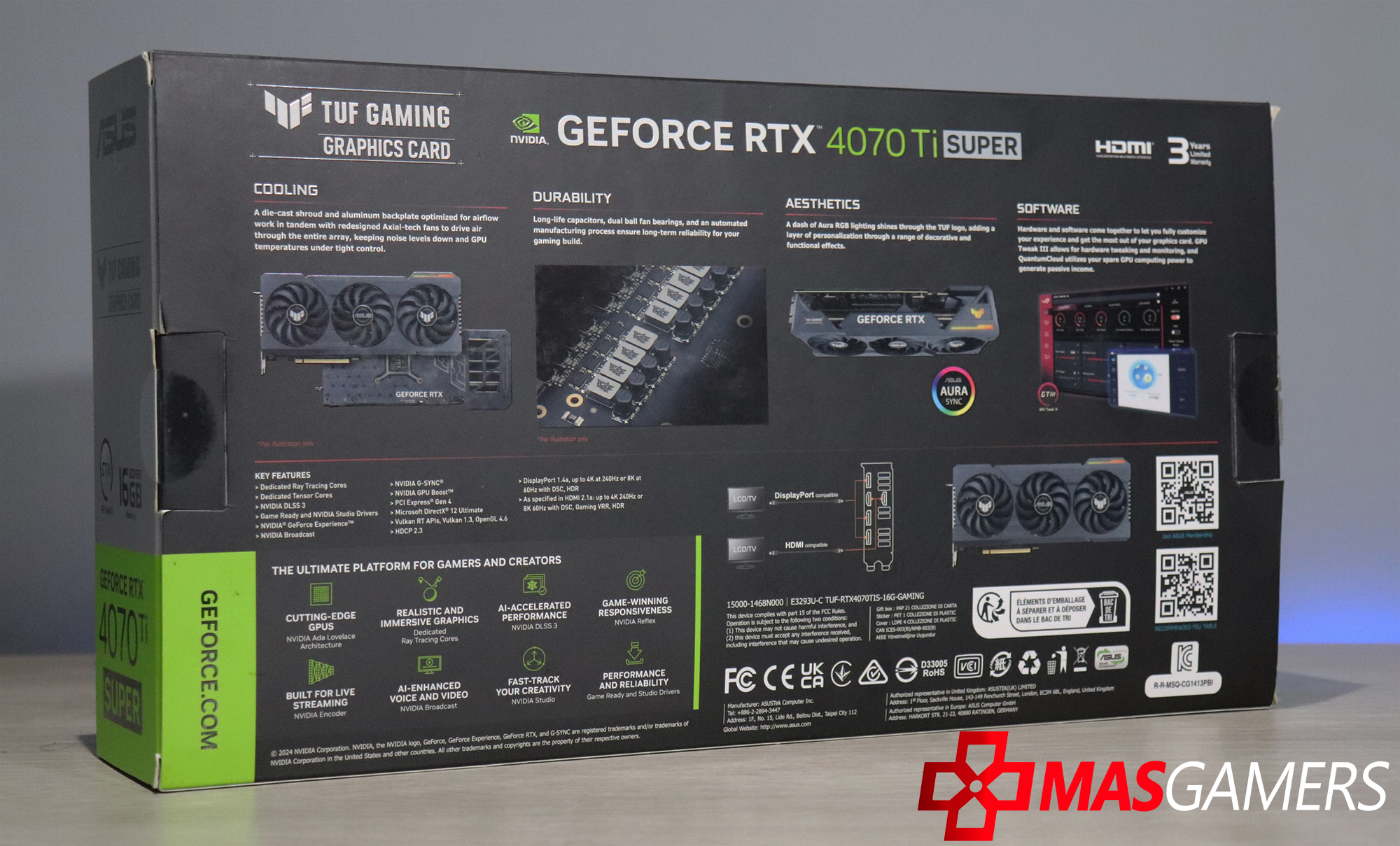 La Asus TUF GAMING RTX 4070TI SUPER viene protegida en una caja con el diseño estándar de los modelos TUF. Una imagen del producto en la parte delantera y el modelo de la GPU en la parte inferior.