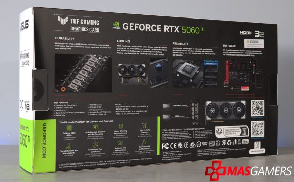 La ASUS TUF Gaming RTX 5060 Ti 16GB llega en una caja de gran tamaño, con el estilo sobrio y robusto característico de la serie TUF. En la parte frontal encontramos una imagen de la tarjeta a escala real, acompañada del logotipo de ASUS y el distintivo TUF Gaming, además de resaltar especificaciones clave como la memoria de 16 GB GDDR7 y la compatibilidad con tecnologías Ray Tracing y DLSS.