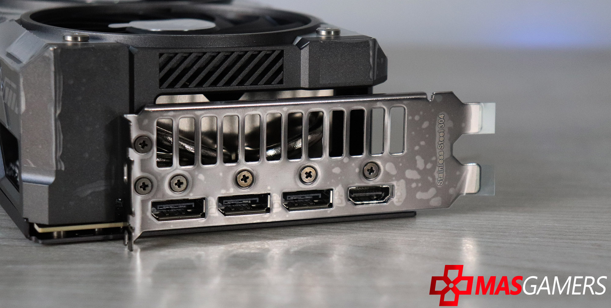 En cuanto a conectividad encontramos lo clásico: 3 puertos Display Port 2.1b y 1 puerto HDMI 2.1. Y como decíamos, si bien solo tiene 2 slots, es necesario dejar al menos 4 para que entre de todo.