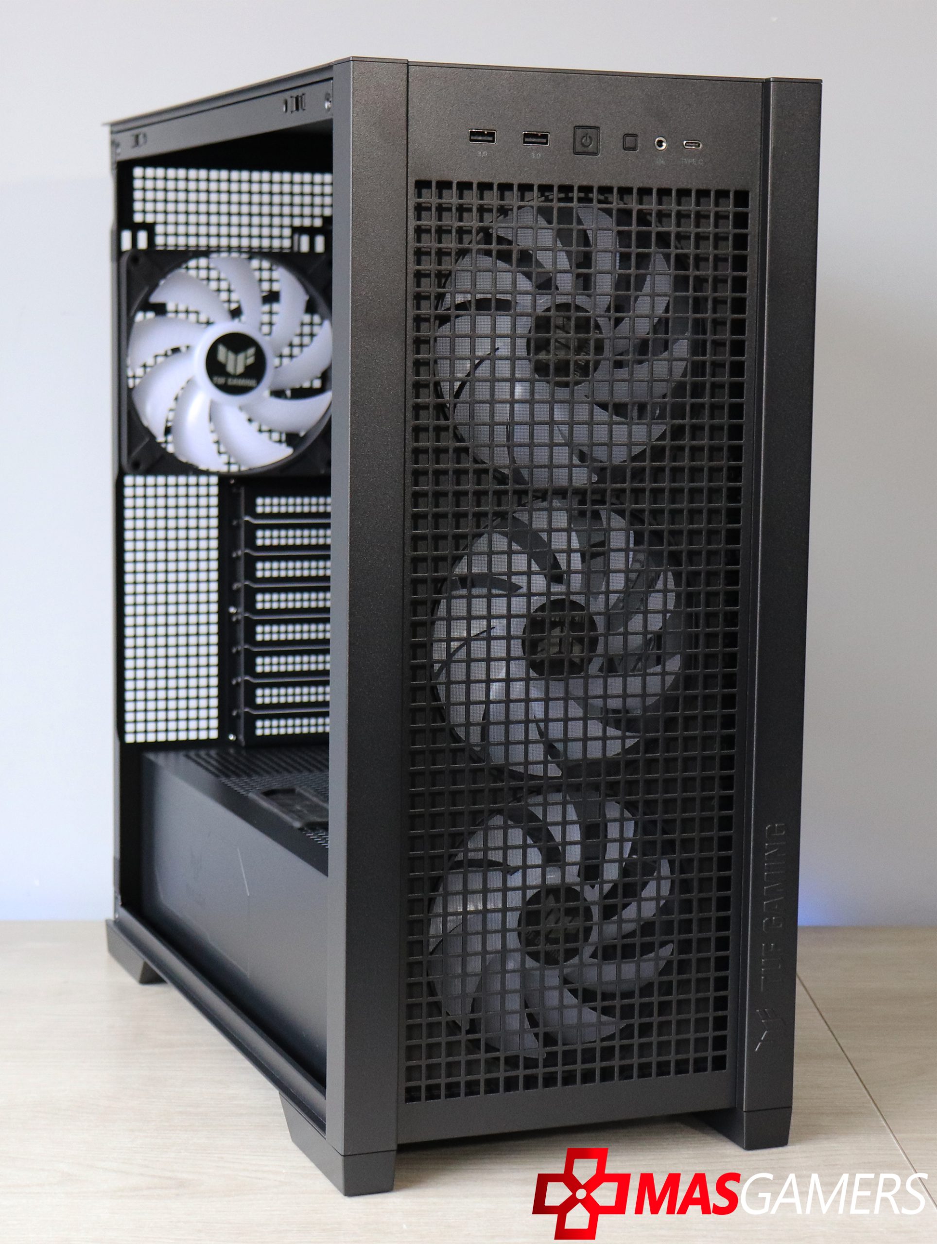 Su vista frontal destaca por un panel de malla metálica de alta densidad que favorece un excelente flujo de aire hacia el interior del chasis. Esta rejilla ocupa toda la parte frontal y está enmarcada por líneas angulares con detalles sobrios en estilo industrial.