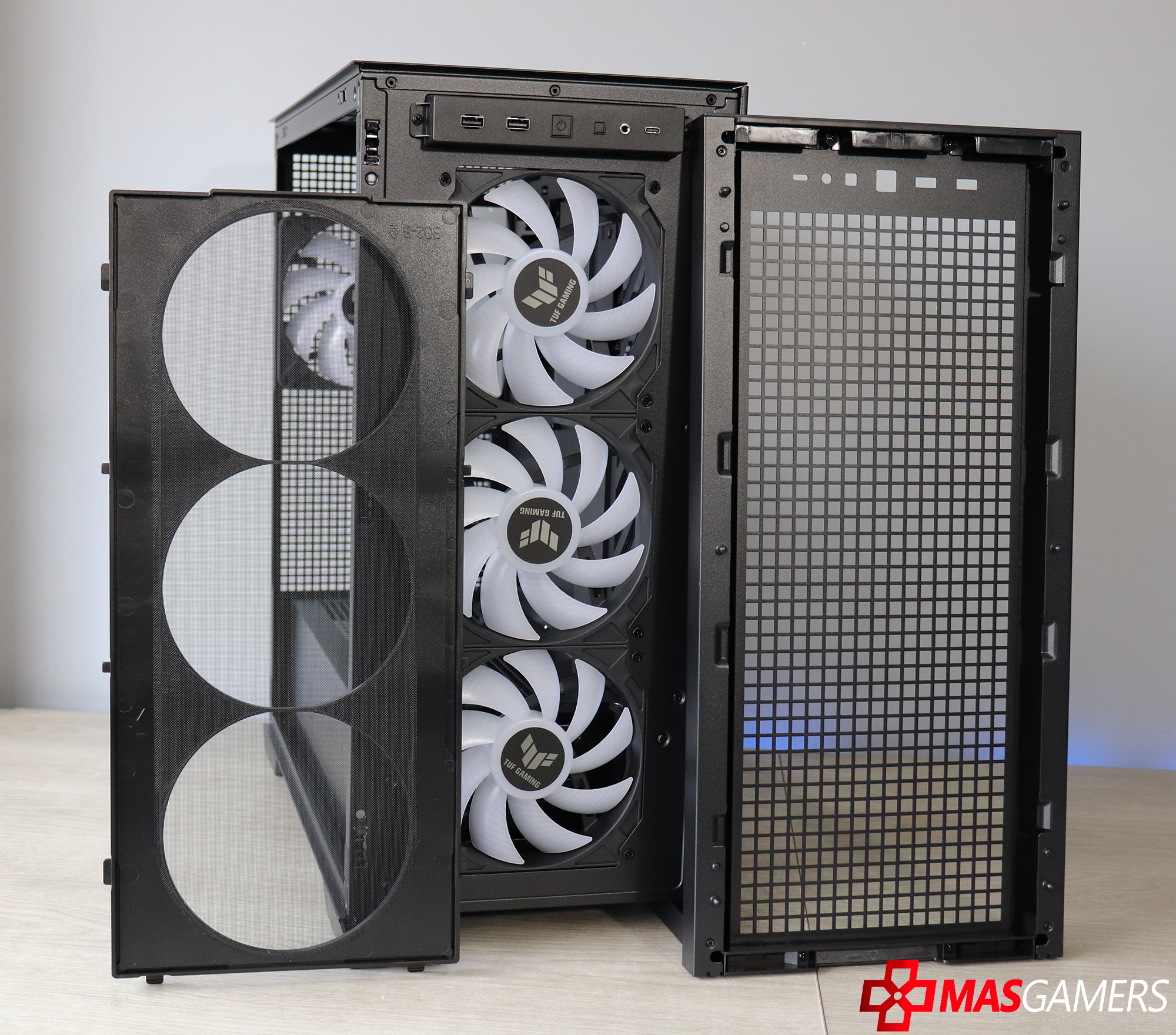 El ASUS TUF Gaming GT302 presenta un diseño robusto y moderno, característico de la línea TUF. En el panel lateral izquierdo, el GT302 luce una ventana de vidrio templado ligeramente tintada, sujeta con un sistema sin tornillos que facilita el acceso al interior. Esta vista lateral permite apreciar todo el hardware con claridad, especialmente la iluminación de los ventiladores y componentes internos.