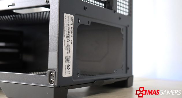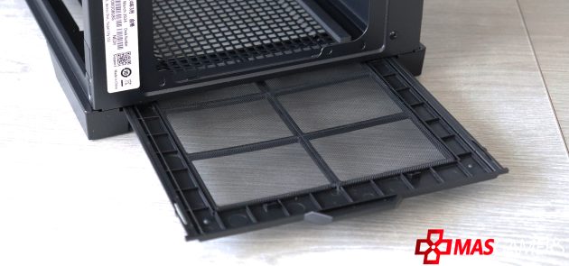 En la parte inferior trasera está ubicada la bahía para la fuente de poder ATX, que se instala de manera tradicional desde la parte interior. Esta zona incluye también un filtro de polvo extraíble en la base, accesible desde el exterior para facilitar su limpieza periódica.
