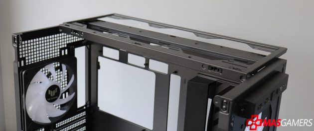 Al abrir el ASUS TUF Gaming GT302, nos encontramos con un interior amplio, bien organizado y claramente pensado para facilitar el ensamblaje de componentes de gama alta. La distribución interna está optimizada para ofrecer un flujo de aire directo y despejado desde los ventiladores frontales hasta la tarjeta gráfica y el procesador, lo cual mejora considerablemente el rendimiento térmico general.