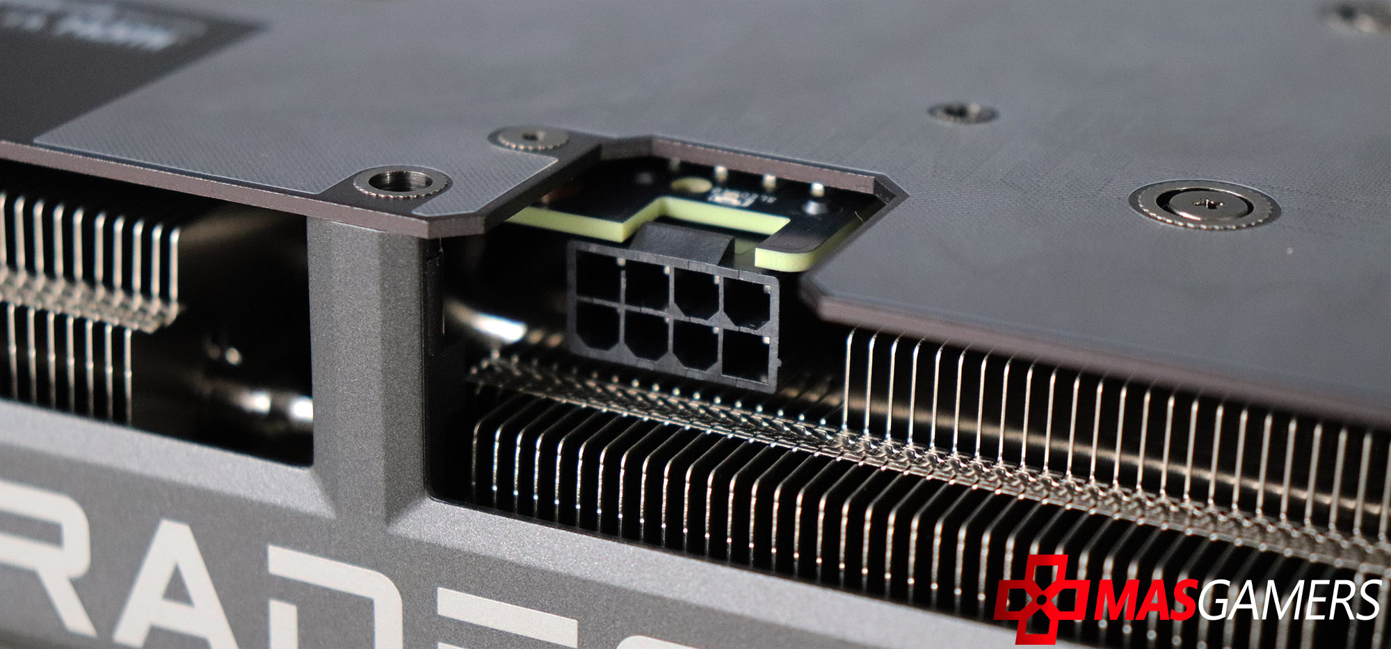 En el lateral está ubicado el conector de alimentación PCIe de 8 pines (debido a que tiene un consumo inferior a 250W ), junto a un pequeño LED que indica el estado de energía.