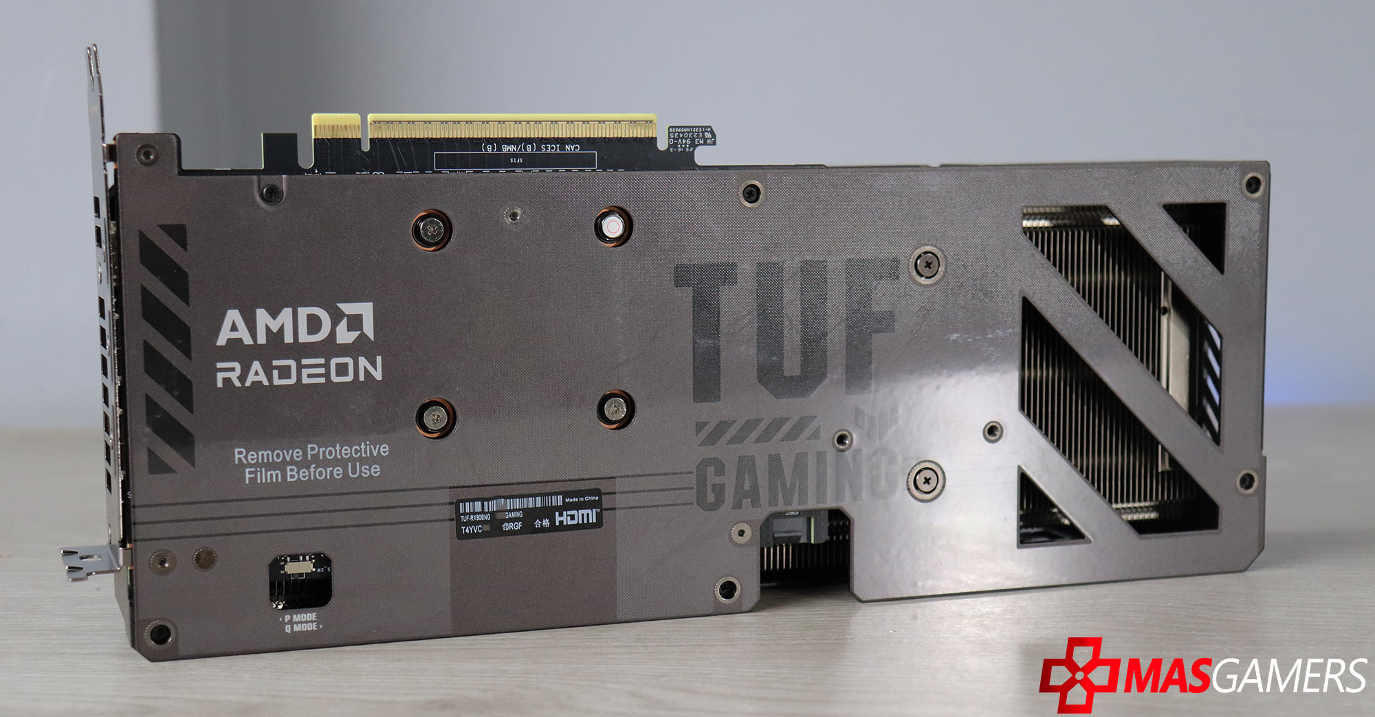 La parte posterior de la tarjeta cuenta con un backplate de aluminio de cuerpo completo, perforado para permitir la ventilación pasiva y reforzar la estructura.