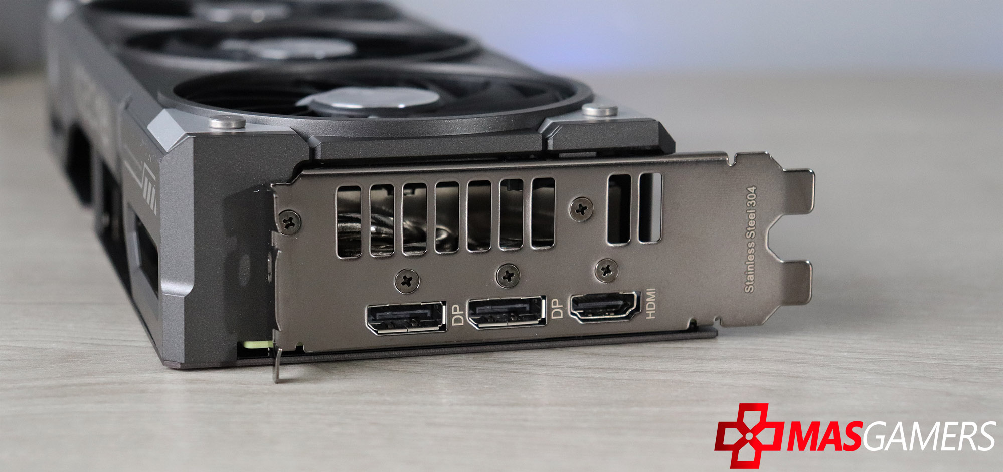 En cuanto a conectividad, incluye dos puertos DisplayPort 2.1a y un HDMI 2.1b, alineados en la parte trasera dentro de una carcasa metálica. Este detalle de contar solo con 3 puertos de vídeo es un detalle que nos parece algo limitado.