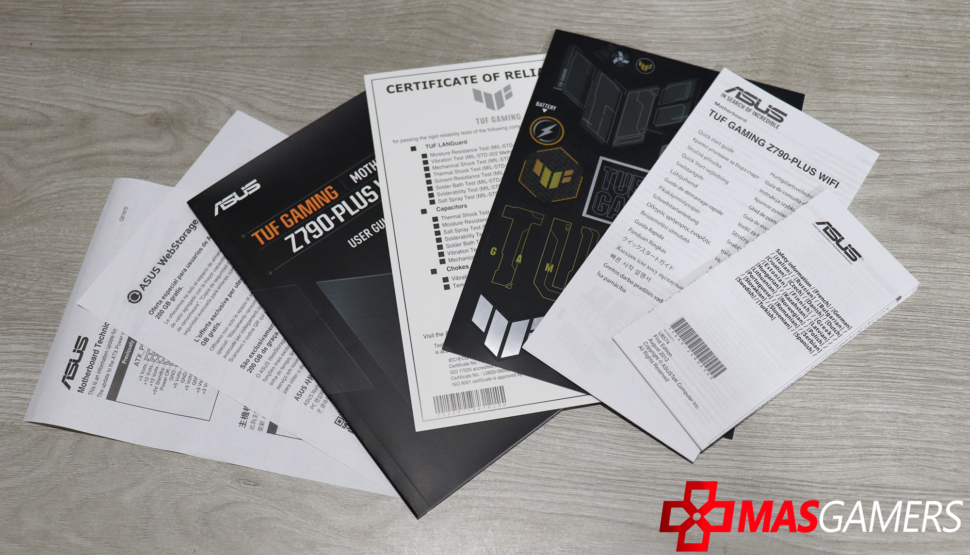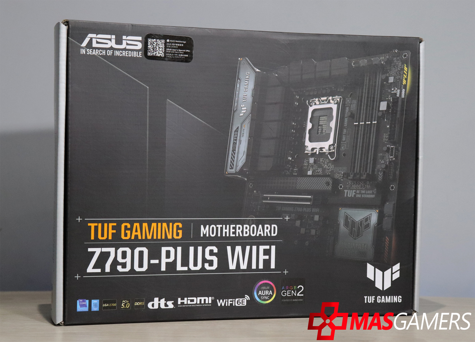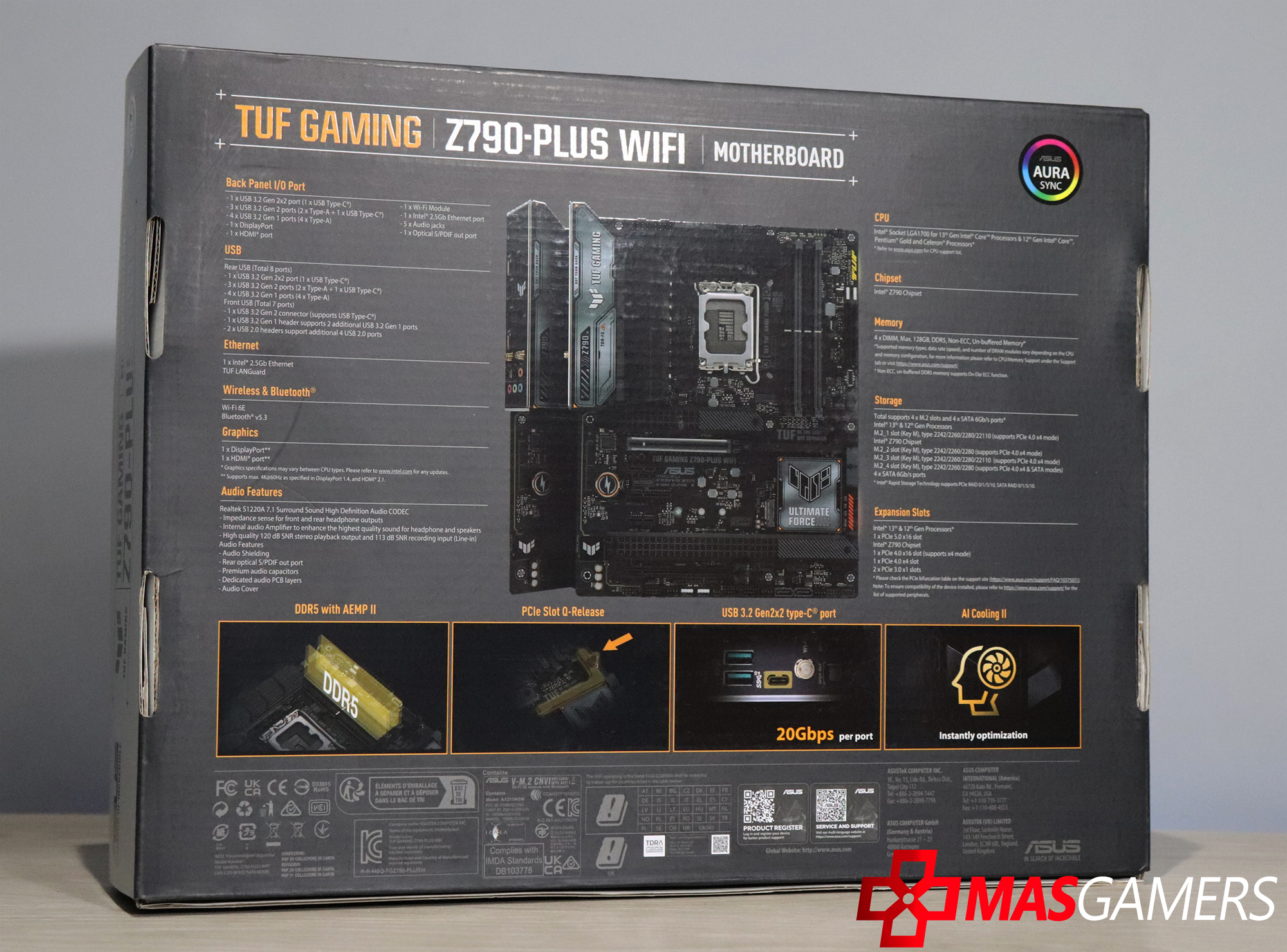 Esta ASUS TUF Z790-PLUS GAMING WIFI viene protegida por la clásica estética TUF en amarillo y negro, mostrando su diseño en el frontal y sus principales características y especificaciones técnicas en el reverso.