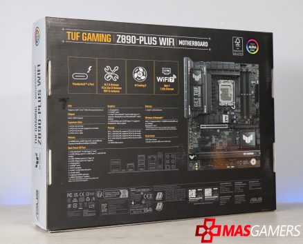 La ASUS TUF GAMING Z890-PLUS Wi-Fi llega en una caja de cartón robusta de tamaño ATX, diseñada para proteger la placa base durante todo el transporte y almacenamiento. Aunque no es ostentosa, el embalaje tiene un diseño limpio y funcional con marca ASUS y gráficos alusivos a la serie TUF Gaming en el exterior, además de información clave impresa en las caras laterales y posterior con especificaciones y características principales del producto (algo habitual en las cajas de placas madres ASUS)