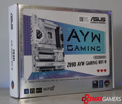 El empaque de la Z890 AYW Gaming WiFi W presenta un diseño robusto y de estética premium, con una caja de acabado semi-mate y detalles metálicos donde resalta el nombre del modelo y una imagen estilizada del producto, acompañada de los principales distintivos como compatibilidad con la nueva generación de procesadores y conectividad avanzada, transmitiendo desde el inicio una identidad orientada al rendimiento.