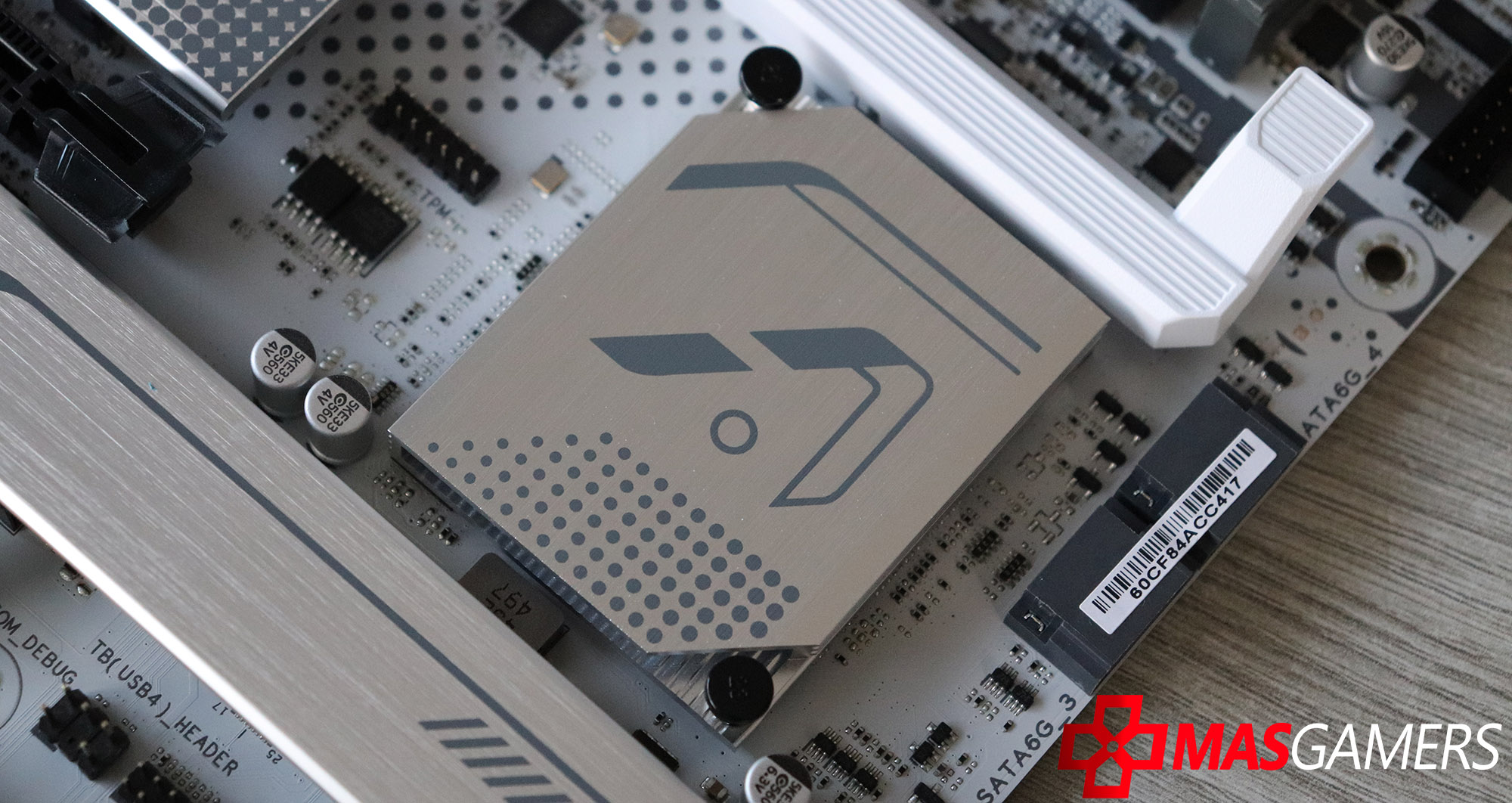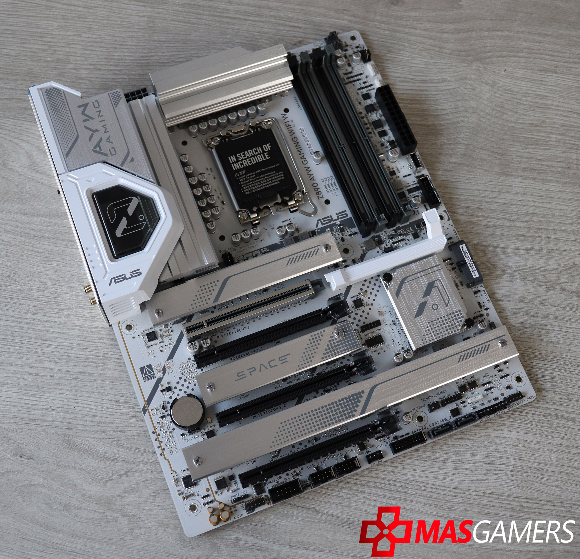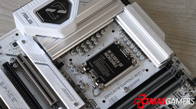 La Z890 AYW Gaming WiFi W presenta un diseño visualmente impactante con un PCB en tono blanco que sirve como base para una serie de disipadores metálicos de gran tamaño que cubren las áreas clave como las VRM, el chipset y las ranuras M.2. Estos disipadores cuentan con cortes angulares y detalles en acabado cepillado que le dan un aspecto moderno y agresivo, ideal para configuraciones gaming de alta gama.