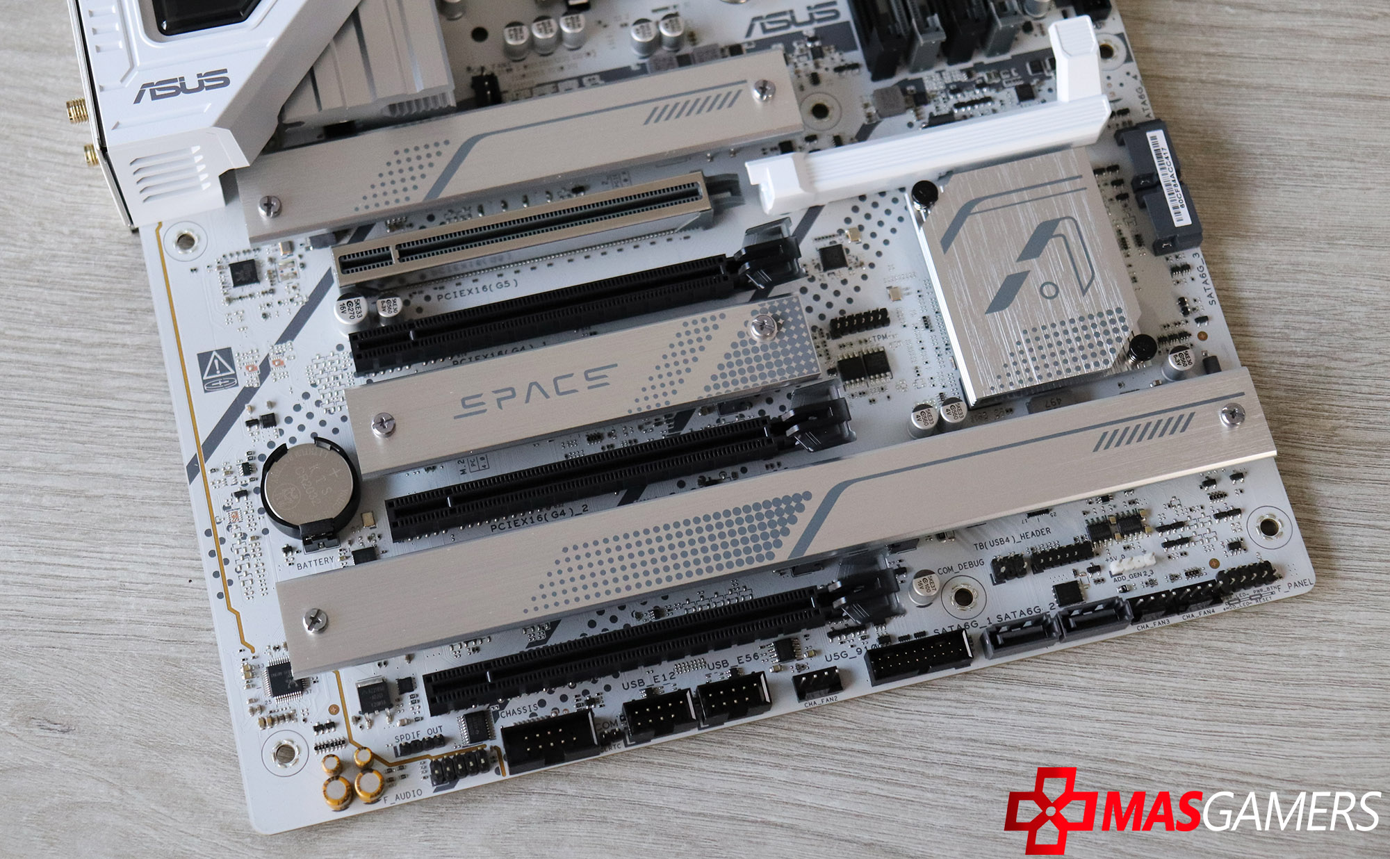 Las ranuras PCIe están orientadas al rendimiento y la durabilidad, destacando una ranura principal PCIe 5.0 reforzada con metal para soportar tarjetas gráficas pesadas sin riesgo de flexión, mientras que las ranuras adicionales, distribuidas de manera estratégica para mantener buena ventilación y compatibilidad PCIe 4.0 para permitir la instalación de tarjetas de expansión de alta velocidad como capturadoras o tarjetas de red, todo con una señalización clara que facilita el montaje en configuraciones avanzadas.
