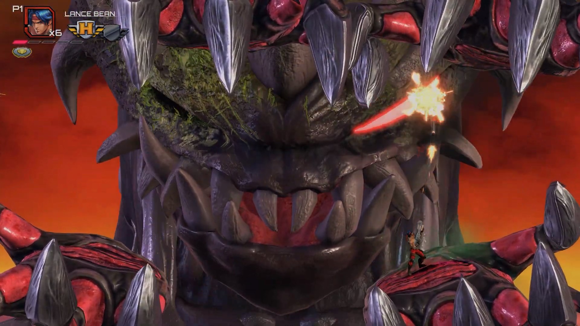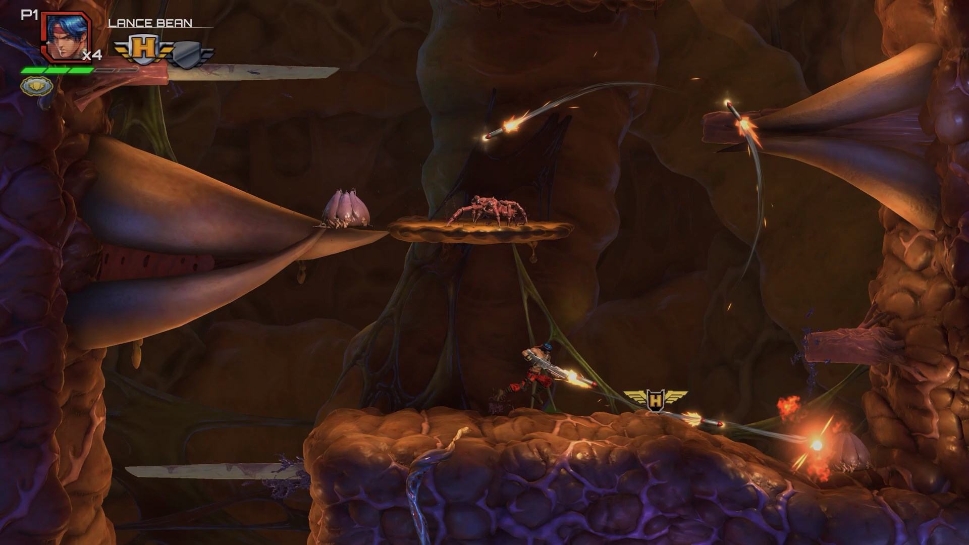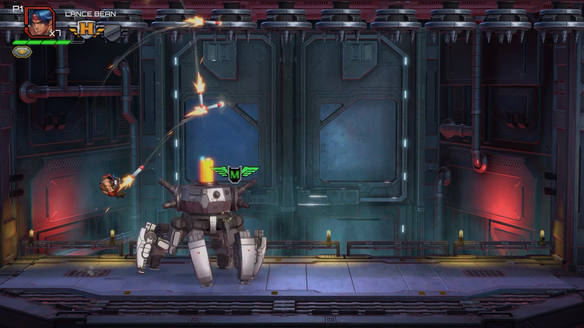 Como todo buen Run and Gun, podemos avanzar y disparar, pero también podemos apuntar libremente, lo cual podemos hacer en 360 grados si usamos el stick. Esto cambia un poco la dinámica del juego, al menos en comparación con los originales. Además, contaremos con un doble salto que facilita mucho el juego para los diferentes niveles plataformeros que se nos presenten, y también con un dash que nos salvará en más de una ocasión.