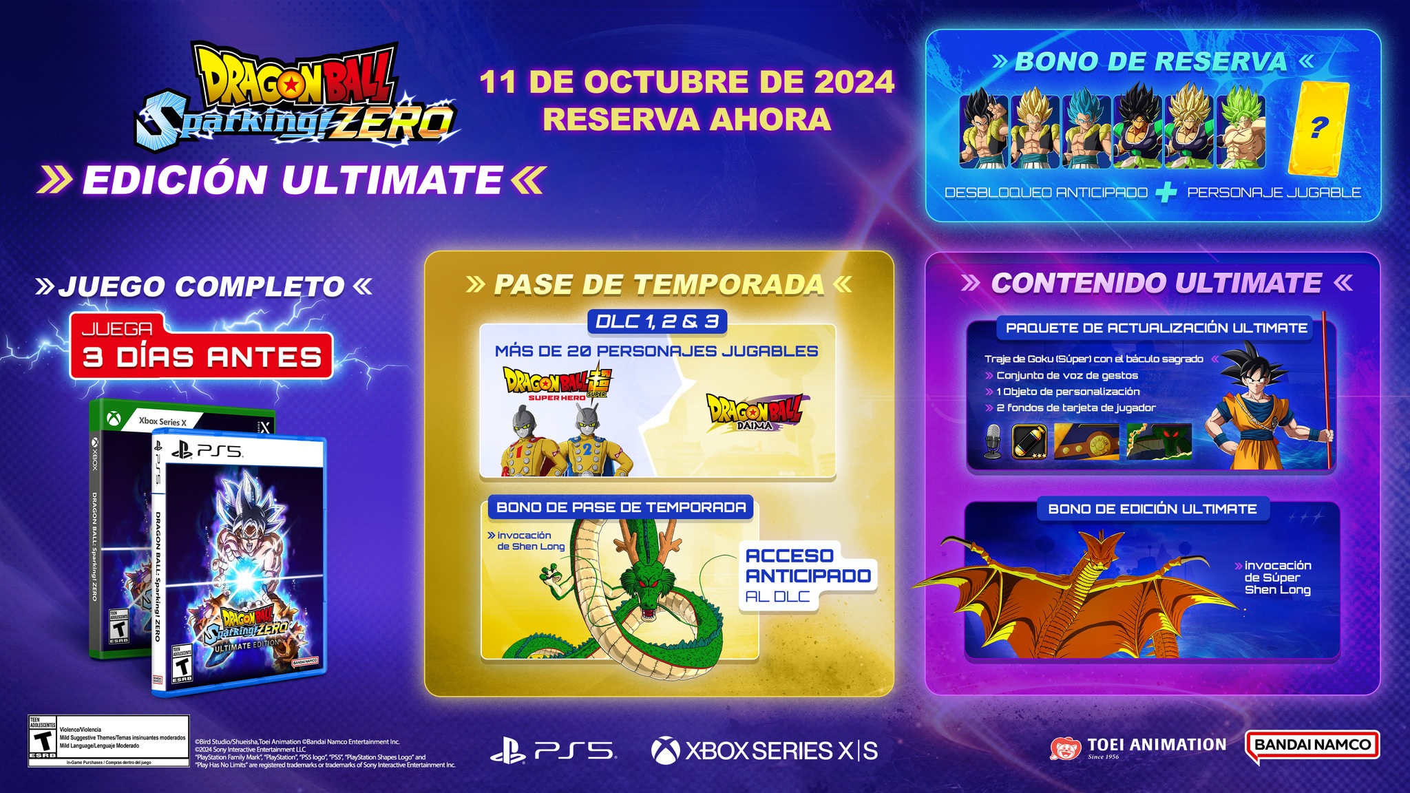 Dragon Ball Sparking Zero confirmó su fecha de estreno para este 11 de octubre. El nuevo tráiler, exhibido en el Summer Game Fest, también sirvió para mostrarnos las ediciones que se pondrán a la venta, y cómo no podia ser de otra forma tenemos la ‘Ultimate Edition’ que nos adelanta el contenido que irá llegando al juego de peleas.