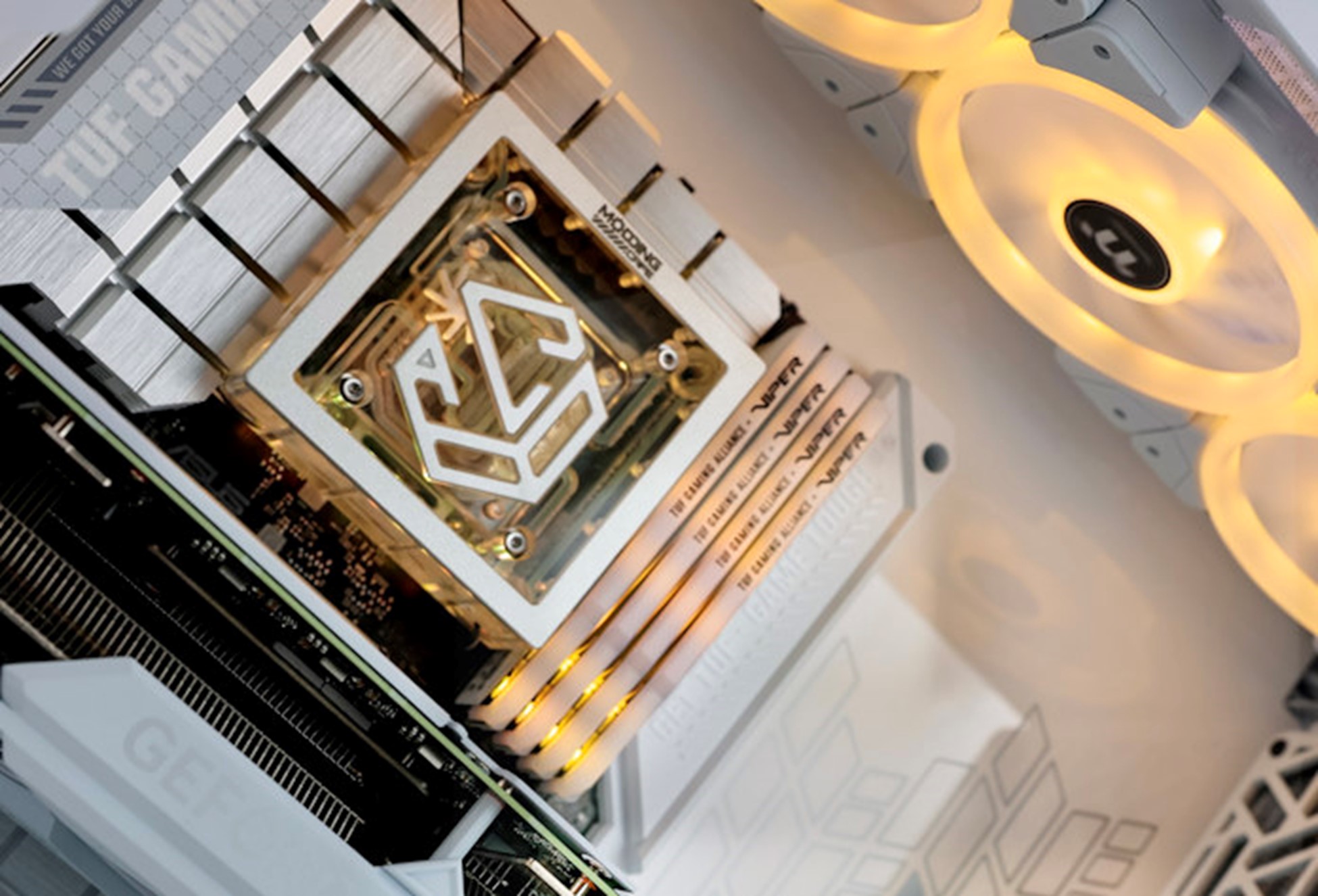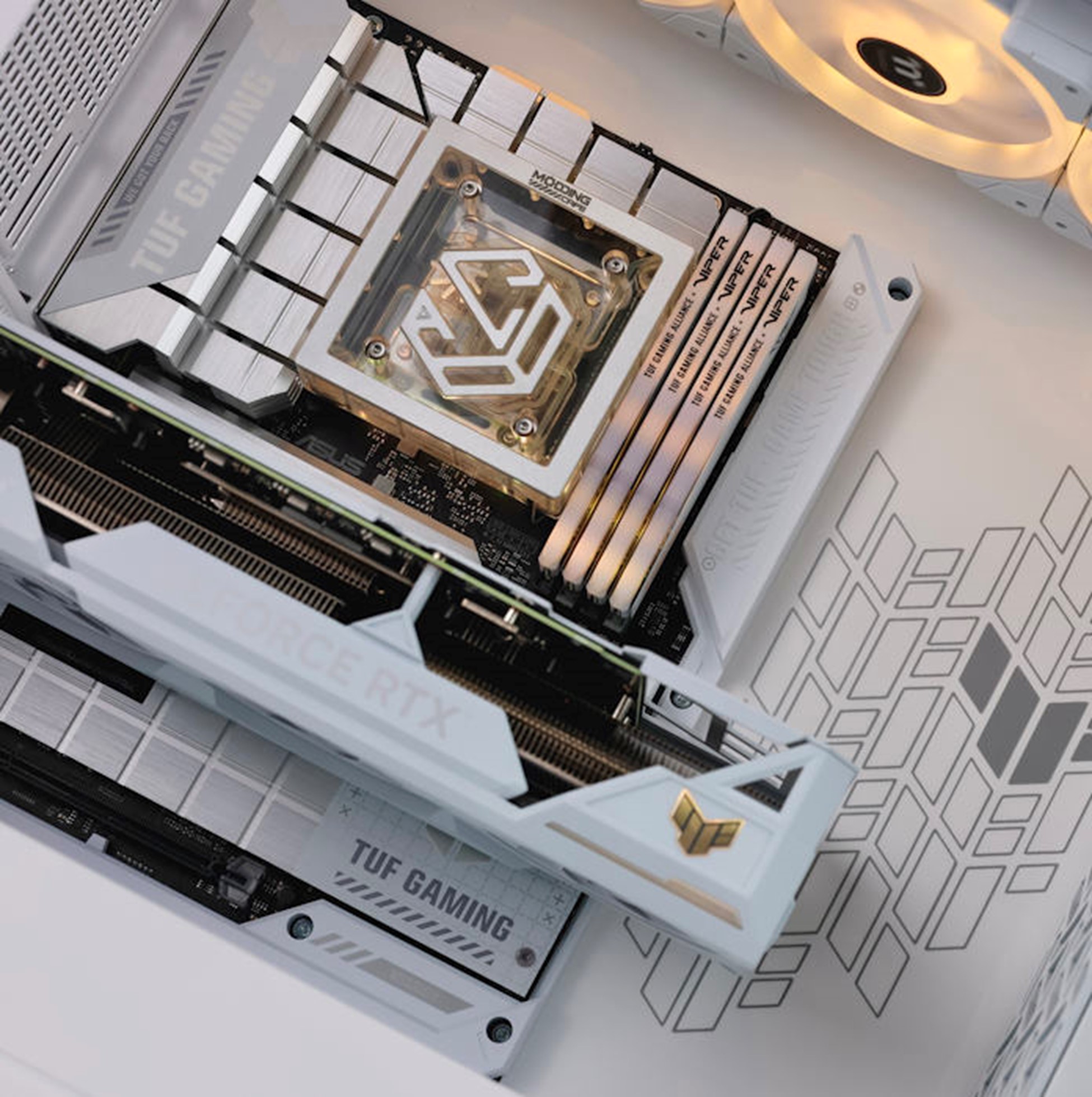 Con los componentes TUF Gaming como base, JCustom se puso manos a la obra para encontrar las piezas complementarias perfectas. Para su montaje, optó por una CPU Intel Core i7-14700K y cuatro memorias DDR5 Viper Elite 5 RGB TUF Gaming Alliance Performance de 16 GB. La fuente de alimentación ROG Strix 850W Gold White Edition mantiene las luces encendidas.