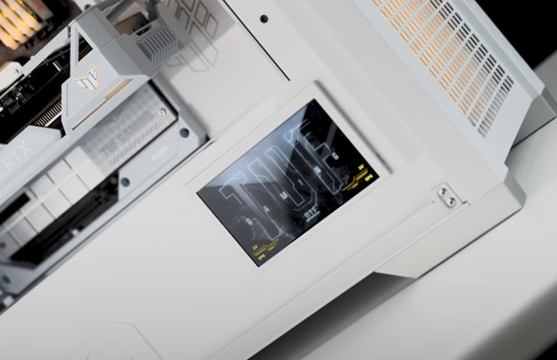 Para darle un toque final elegante, JCustom montó una pequeña pantalla en el lateral de la cubierta de la fuente de alimentación. En ella muestra con orgullo un logotipo animado de TUF Gaming y lecturas en tiempo real de las temperaturas de la CPU y la GPU, porque además de artista es un entusiasta del PC. Si estás interesado en hacer algo similar, recomienda una pantalla USB-C que ejecute código Python de código abierto para que puedas evitar pasar un cable desde el chasis hasta la E/S trasera de la tarjeta gráfica.