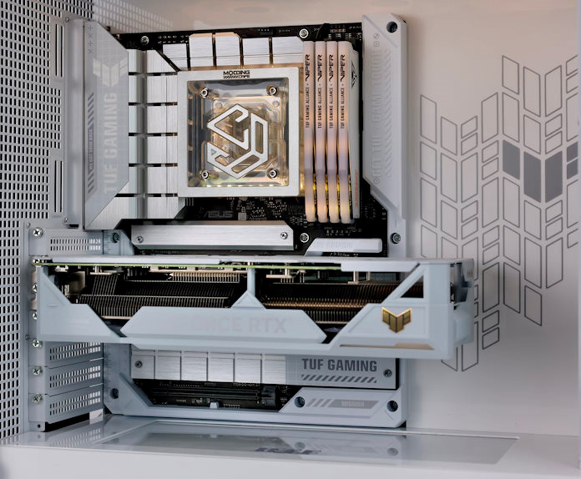 Además, la TUF Gaming Z790-BTF WiFi admite un enfoque de montaje BTF avanzado que oculta los cables de alimentación de la GPU. Esta placa base incluye una ranura de alta potencia capaz de suministrar hasta 600 W a la tarjeta gráfica. Esto requiere una tarjeta gráfica con el conector necesario, por lo que configuramos JCustom con una TUF Gaming GeForce RTX 4070 Ti SUPER BTF White Edition. Esta potente GPU está preparada para un PC BTF avanzado, y está vestida con el mismo blanco elegante que la TUF Gaming Z790-BTF WiFi para ofrecer un aspecto coherente.