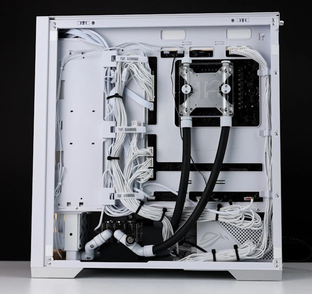 La TUF Gaming BTF de JCustom muestra lo que los entusiastas del PC creativos y con talento pueden lograr utilizando componentes BTF como base. Su enfoque no sólo oculta los cables de alimentación, ventiladores y E/S, sino también los tubos del circuito de refrigeración líquida de la CPU. El resultado es un PC fantásticamente limpio con una estética impresionante.
