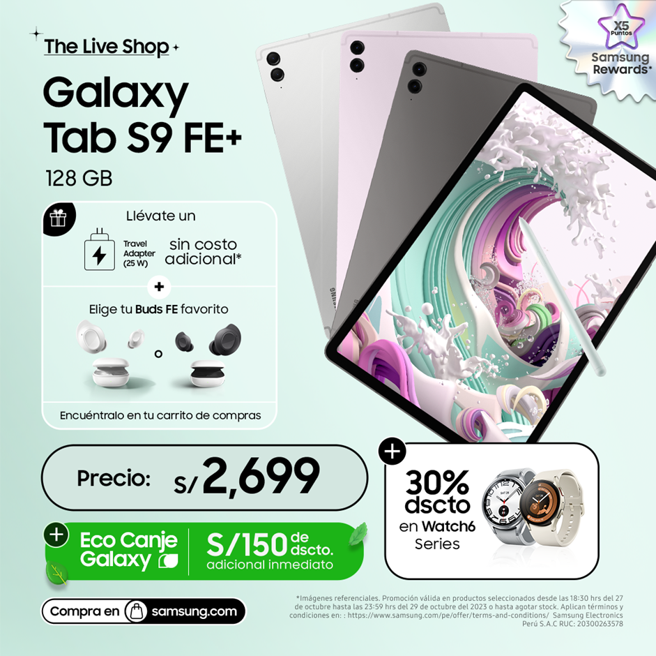 Para conocerlos, conéctate desde las 6:30 p. m. al The Live Shop y descubre las grandes promociones que Samsung ha preparado a través de www.samsung.com y el aplicativo Samsung Shop*. Estos beneficios estarán disponibles solo hasta el 29 de octubre.