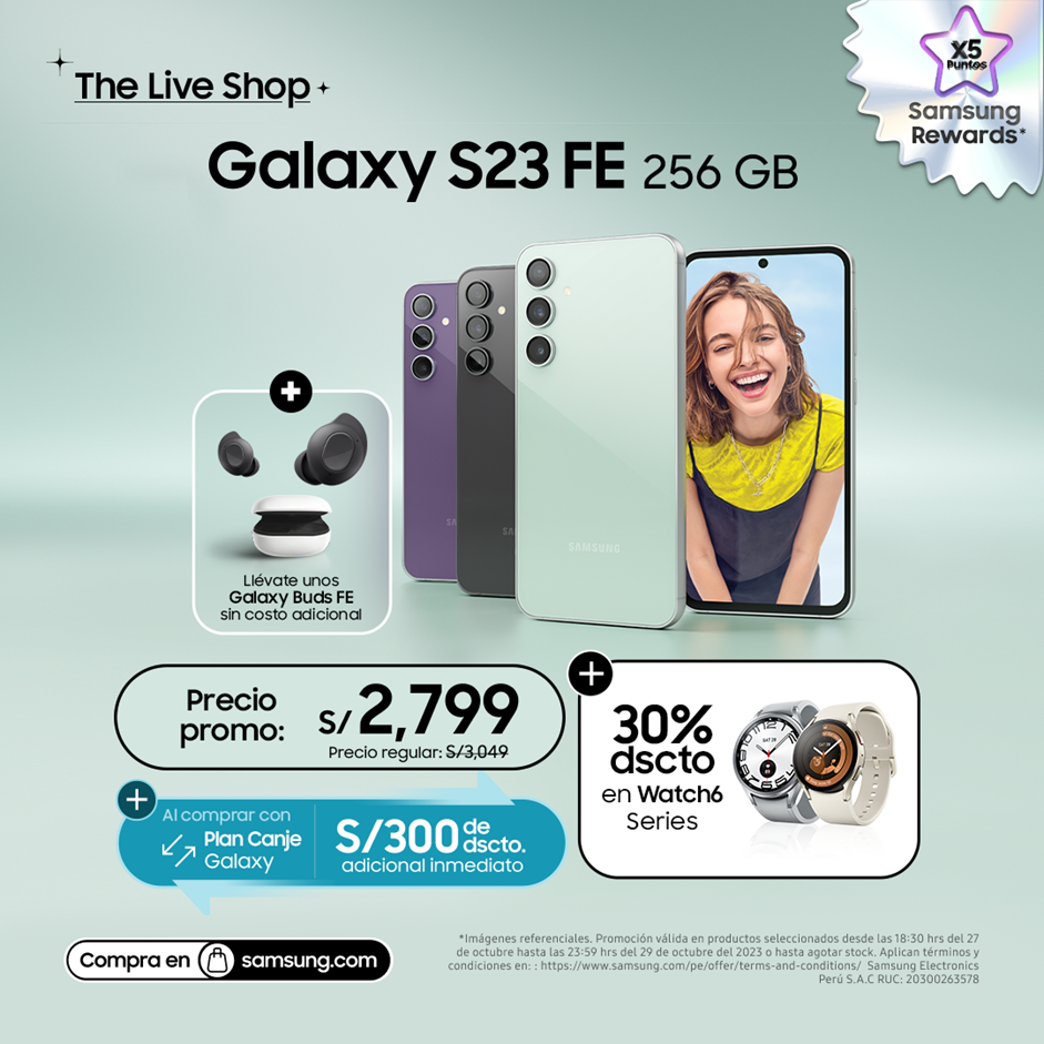 El Galaxy S23 FE mantiene las funcionalidades de la serie S, sin dejar de lado sus acabados premium. Cuenta con materiales reciclados y una pantalla elegante, protegida con la certificación IP68, que le permite resistencia al agua y al polvo. Además, durante la transmisión en vivo podrás elegir el color vibrante que más se adapte a tu personalidad, accediendo a una increíble promoción por lanzamiento, disponible solo hasta este domingo 29 de octubre a través de www.samsung.com y el aplicativo Samsung Shop.