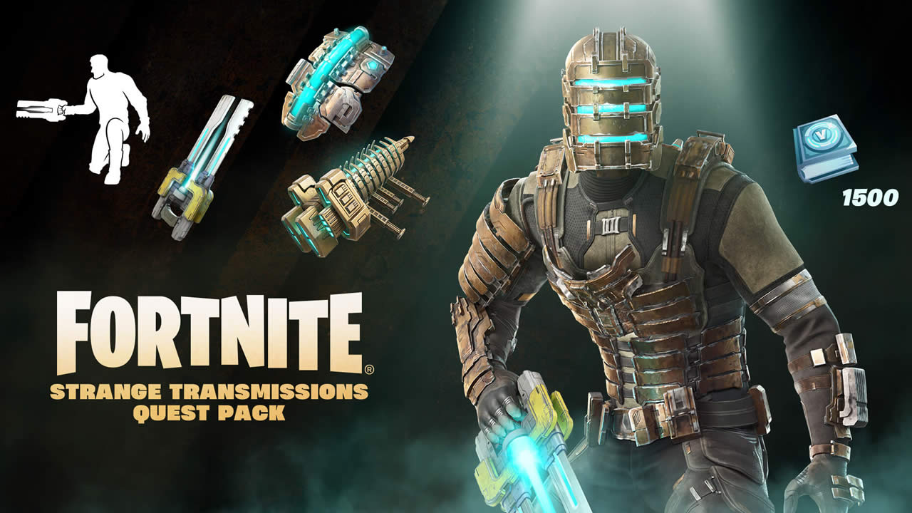 Este nuevo pack de cosméticos se titula Strange Transmissions Quest Pack e incluye la skin de Isaac Clarke, protagonista de la saga Dead Space, además de elementos brandeados para Fortnite. Tiene un costo de 12 dólares e incluye nuevas misiones para ganar hasat 1,500 «pavos».