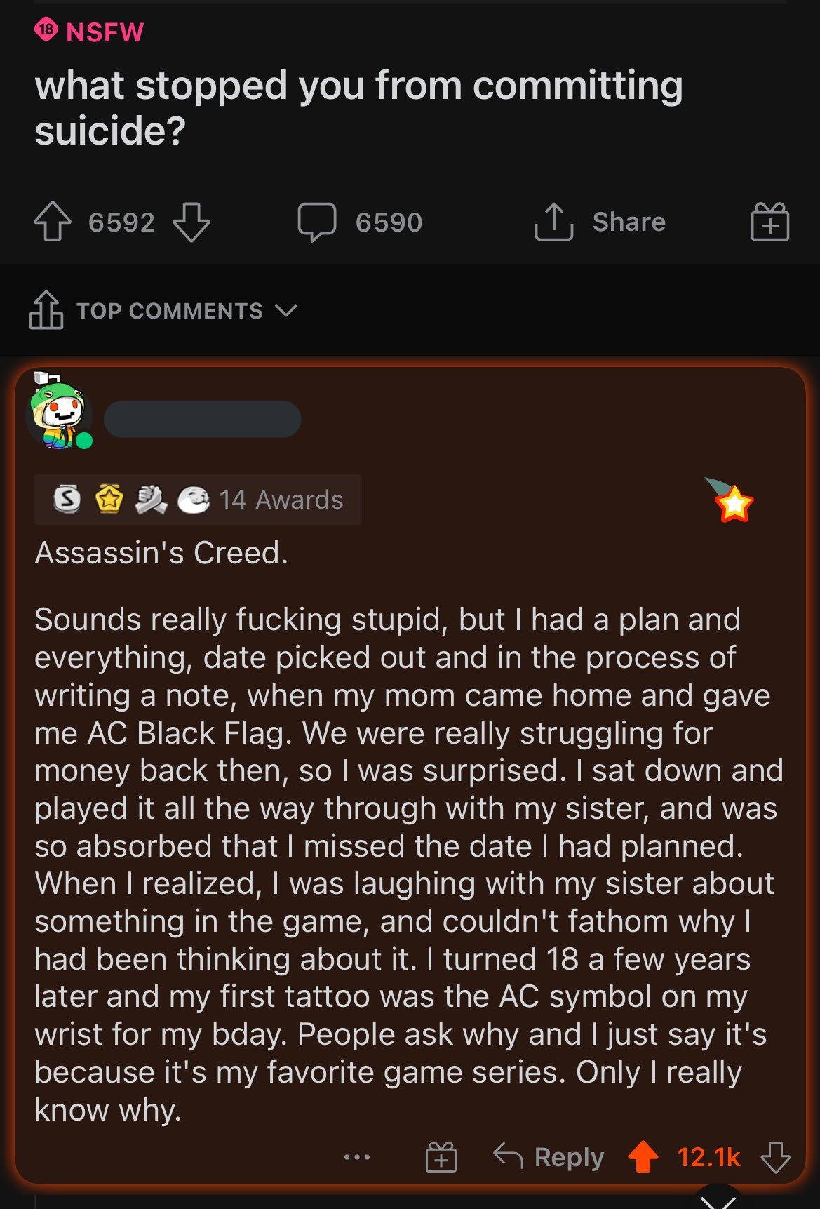 Un gamer decidió aprovechar en hablar sobre un tema bastante delicado que es el suicidio; a raíz de la pregunta: «¿Qué los detuvo de cometerlo?«. El usuario sorprendió revelando que uno de los motivos fue nada menos que ‘Assassin’s Creed Black Flag‘, la cuarta entrega de la conocida saga de Ubisoft estrenada en el año 2013.