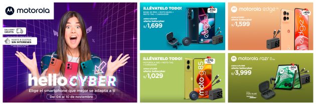 Del 4 al 10 de noviembre, Motorola celebrará el HELLOCYBER en su tienda en línea, ofreciendo por primera vez combos exclusivos con productos de su ecosistema a precios especiales. Además, será posible adquirir smartphones y otros dispositivos con beneficios como envíos gratuitos y opción de pago en 6 cuotas sin intereses para compras a partir de S/ 1,000 (válido con tarjetas Diners Club, BBVA, Interbank y BCP Visa).