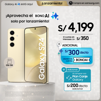 En el caso del Galaxy S24, usando el cupón Bono AI tendrás un descuento de S/ 300.00. Y si lo compras a través del Plan Canje Galaxy, tendrás un descuento adicional de S/ 200.00