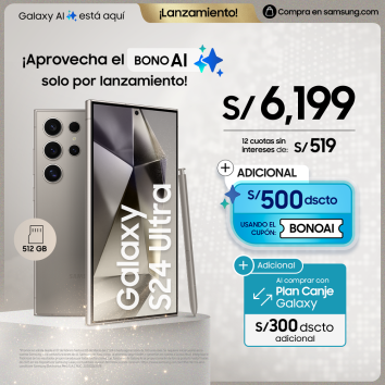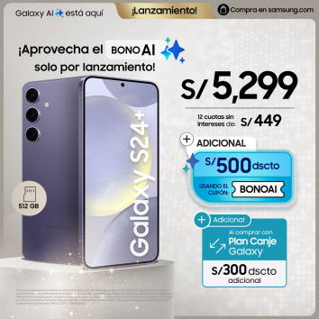 Si prefieres el Galaxy S24 Plus o el S24 Ultra, usando el cupón Bono AI tendrás un descuento adicional de S/ 500.00. Y si lo compras a través del Plan Canje Galaxy, tendrás un descuento adicional de S/ 300.00