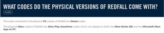 Esto fue confirmado revisando la web oficial de Bethesda en la sección «Preguntas Frecuentes» que avisa que la versión física de Redfall para Xbox traerá un cupón con un código de Xbox Play Anywhere. Éste deberá usarse para descargar el juego, sea en consola o en PC.