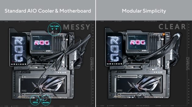 Algunos conceptos de hardware ROG que demuestran un nuevo enfoque de la gestión de cables. Los creadores a los que les gusta mantener los cables de su PC limpios y ordenados tienen que prestar mucha atención a su sistema de refrigeración. Los cables de los ventiladores se extienden por todo el chasis, y los cables del refrigerador líquido de la CPU AIO son aún más problemáticos, ya que se conectan al componente que suele estar en el centro de cualquier PC terminado.