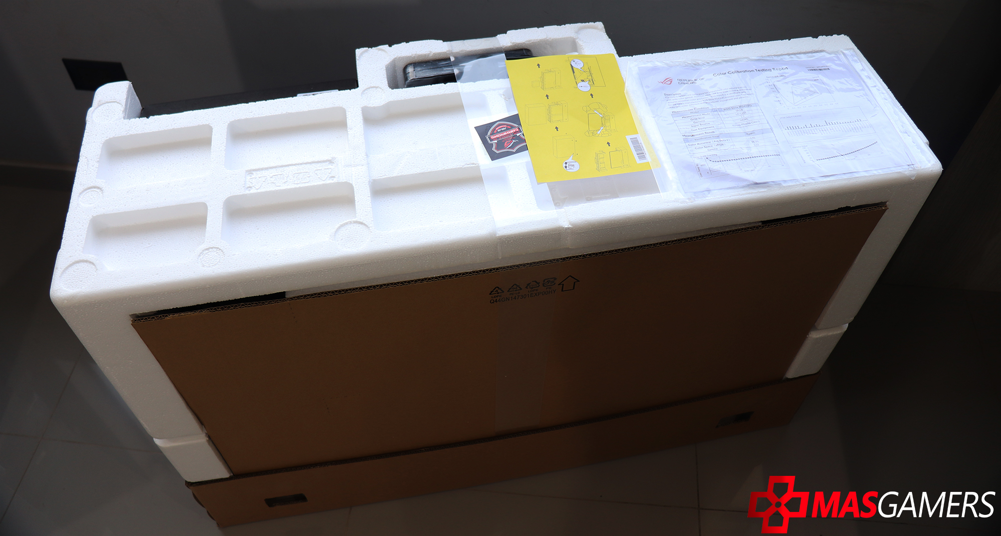 Debido al tamaño y peso del monitor, el desempaque es más cómodo entre dos personas, aunque ASUS lo ha diseñado para facilitar el proceso: al abrir la parte superior, te encuentras con una cubierta de espuma protectora de alta densidad que encierra todos los componentes con seguridad.