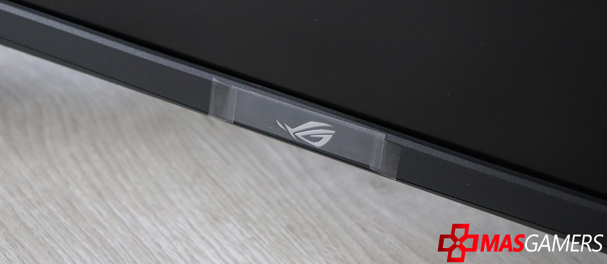 El marco frontal es delgado en los laterales y la parte superior, aunque un poco más grueso en la parte inferior, donde se sitúa el logotipo de ROG en el centro.