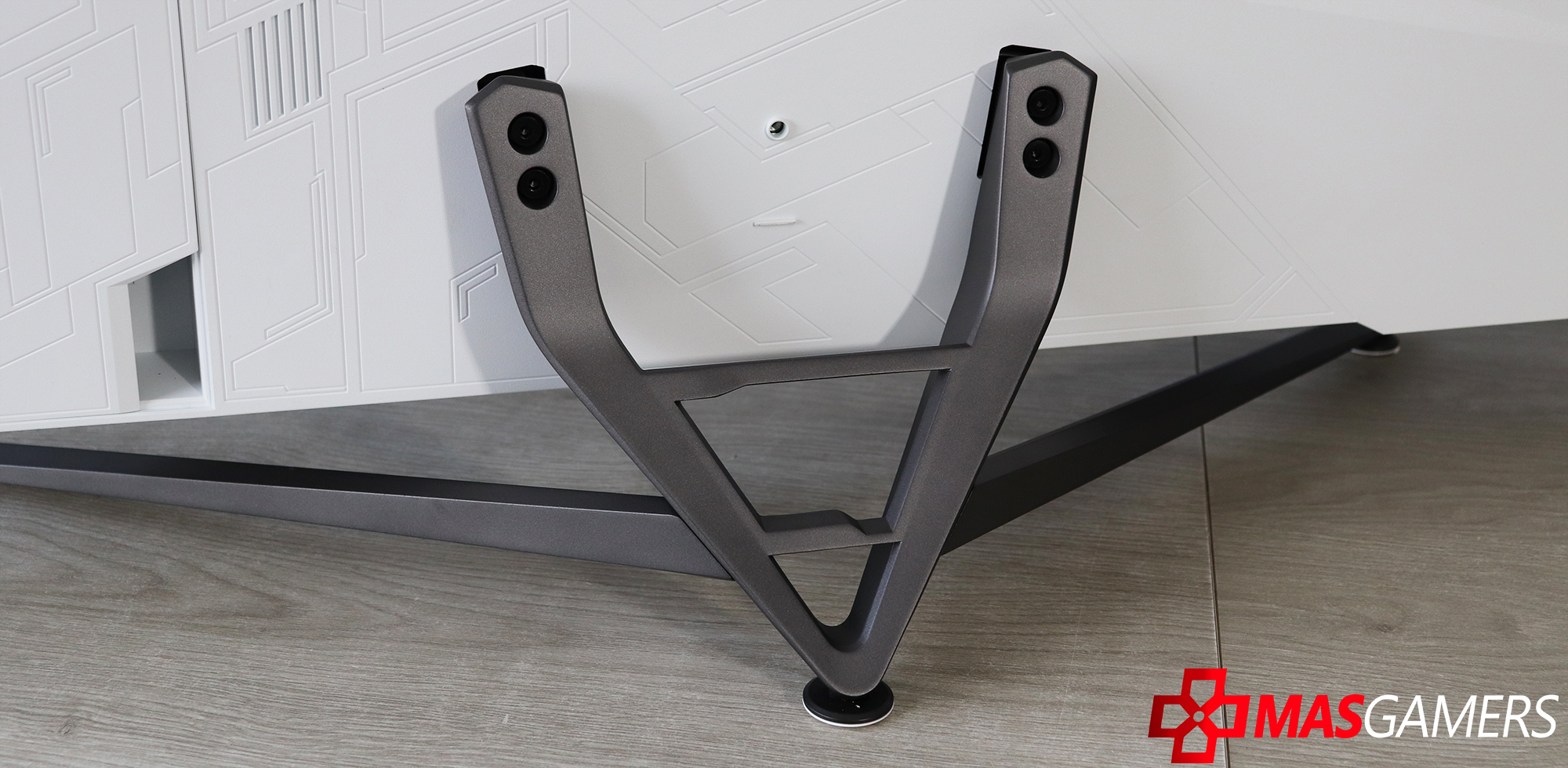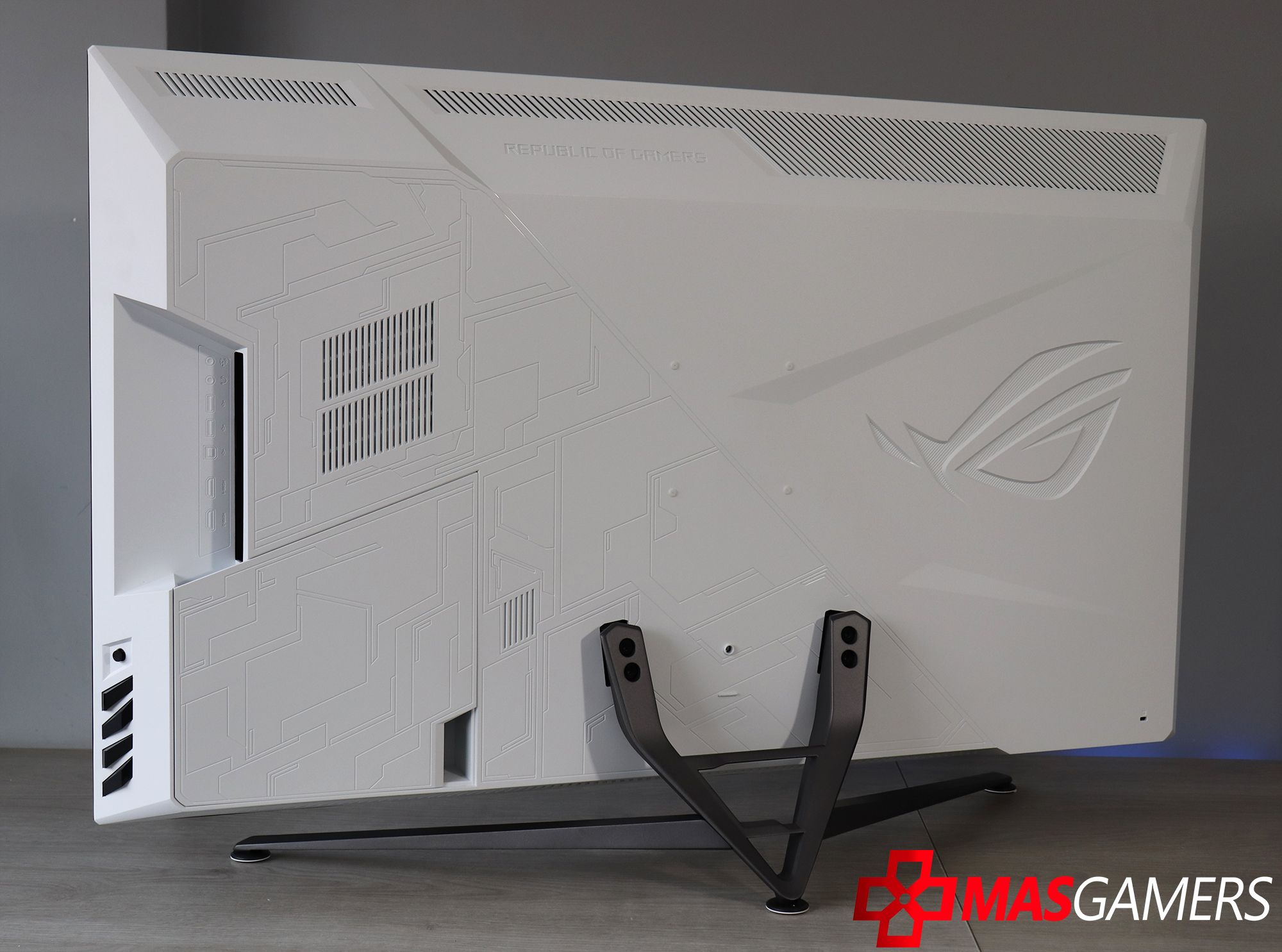 En la parte trasera, el monitor luce un diseño agresivo, con líneas anguladas y una retroiluminación RGB en la parte inferior que se puede personalizar a través de Aura Sync, lo que añade un toque de personalización visual. También está presente la ventilación pasiva en las esquinas superiores para asegurar una correcta disipación del calor, algo especialmente importante en monitores de gran tamaño y resolución.