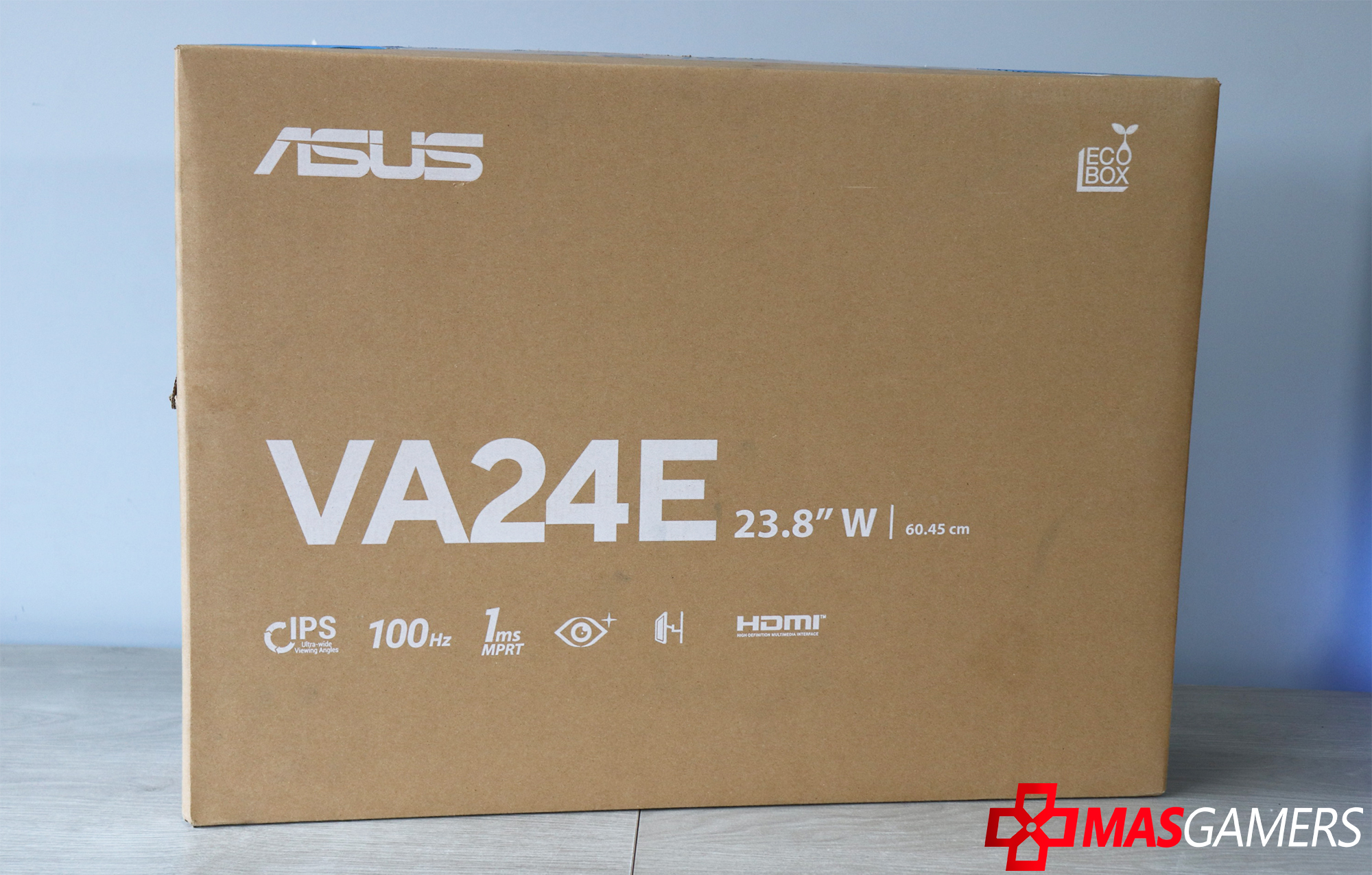 El empaque exterior es el clásico de los monitores ASUS, una caja de cartón con impresión de la imagen del producto y características en color negro. Funciona y simple.
