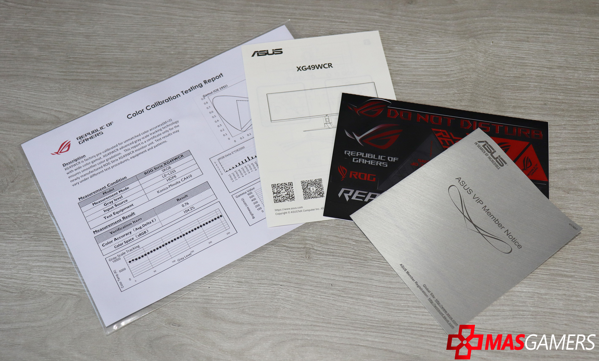 | Accesorios | Color pre-calibration report Cable DisplayPort Cable HDMI Cable de alimentación Guía de inicio rápido ROG pouch ROG sticker USB Type-B to A cable USB-C cable Tarjeta de garantía Wall-Mount Spacer Screw x4 |