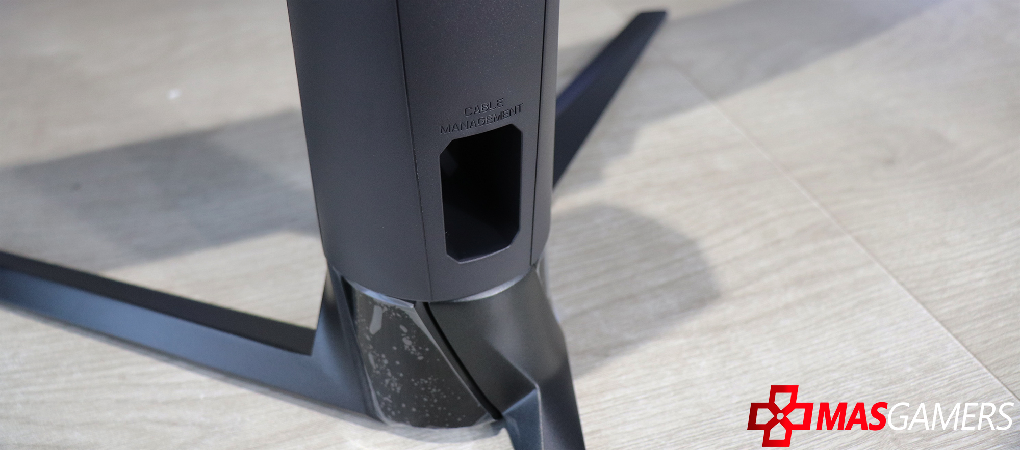 Además del diseño robusto, el monitor incluye un soporte ergonómico ajustable que permite modificar la altura, inclinación y rotación, lo que lo hace cómodo para largas sesiones de uso. Inclusive este soporte también cuenta con un agujero para el manejo de cables.