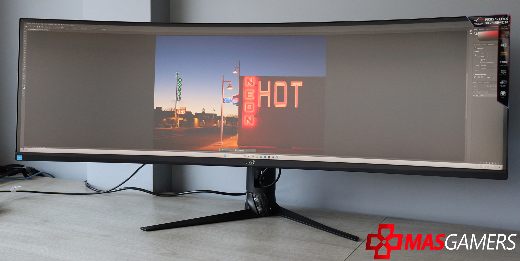 El tamaño considerable, con una diagonal de 49 pulgadas y una relación de aspecto 32:9, lo que equivale a la combinación de dos monitores de 27 pulgadas colocados lado a lado. Sus dimensiones, cuando está montado en su soporte, lo que lo convierte en una pantalla realmente grande que ocupa mucho espacio en el escritorio, pero ideal para quienes desean reemplazar una configuración de doble monitor.