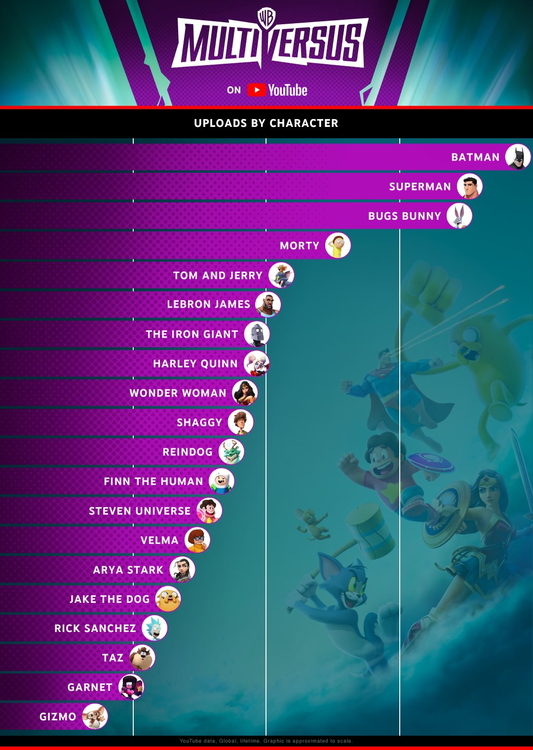A través de Twitter, la cuenta oficial de ‘Youtube Gaming‘, presentó una gráfica dónde detallan cuáles son los peleadores favoritos de numerosos influencers, quienes a día de hoy continúan realizando contenido en base a MultiVersus. Así, el primer lugar se lo lleva Batman, seguido de Superman, y en tercer lugar, Bugs Bunny. Tres de los personajes más populares de Warner Bros. han demostrado ser lo suficientemente divertidos para estar en puestos altos dentro del ranking de Youtube.