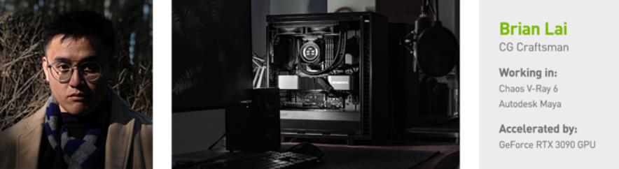 El trazado de rayos acelerado por RTX ocurre a la velocidad del rayo en la GPU V-Ray con denoising impulsado por IA. Lai prefiere V-Ray «principalmente porque utiliza la potencia de RT y Tensor Cores en la tarjeta gráfica», dijo. «Realmente no me siento limitado por el software».