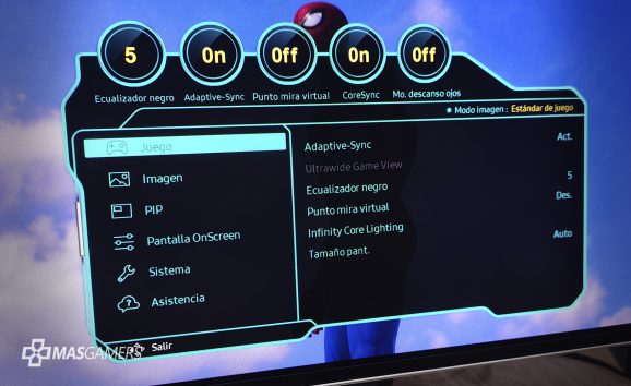 En la sección de Juego, el Odyssey OLED G6 permite activar o desactivar el Sync, lo que ayuda a evitar problemas de fragmentación en resoluciones altas. Además, ofrece la opción de activar una mira virtual, que coloca un punto destacado en el centro de la pantalla, útil especialmente en juegos tipo shooter, funcionando como una especie de trampa al ofrecer una mira más grande y visible que la del juego. También es posible personalizar los colores del aro de luz, eligiendo entre diferentes estilos de animación y colores o sincronizándolos con lo que ocurre en la pantalla. Sin embargo, para una mayor visibilidad del aro, es ideal tener una pared blanca cerca.