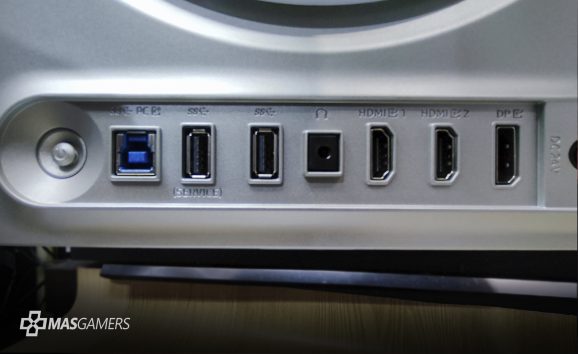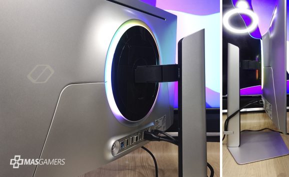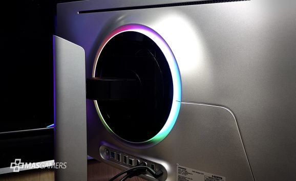 En la parte posterior del Odyssey OLED G6, encontramos un diseño metalizado con líneas sutiles que resaltan el logo de Odyssey. Destaca también el aro RGB programable para personalizar los colores. Sobre este se ubica una salida de calor, mientras que en la parte inferior están las conexiones, que incluyen: un puerto USB-B para conexión directa a PC, dos entradas USB-A 3.0, dos puertos HDMI 2.2, y un DisplayPort 1.4 que permite aprovechar la tasa de refresco de 320Hz. También cuenta con una entrada Jack 3.5 mm para audífonos, un puerto de alimentación y un pequeño joystick para manejar las opciones y el menú del monitor.