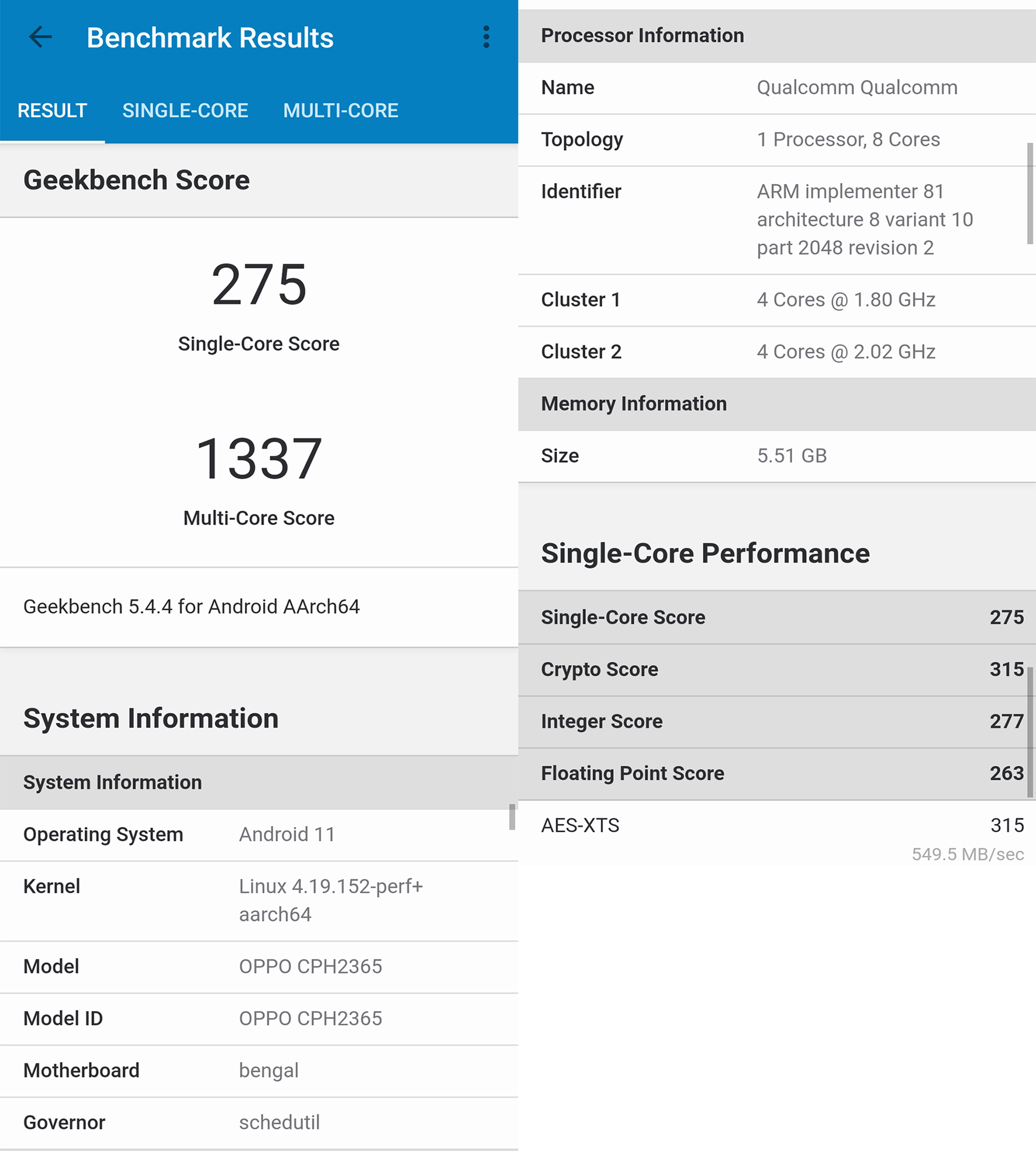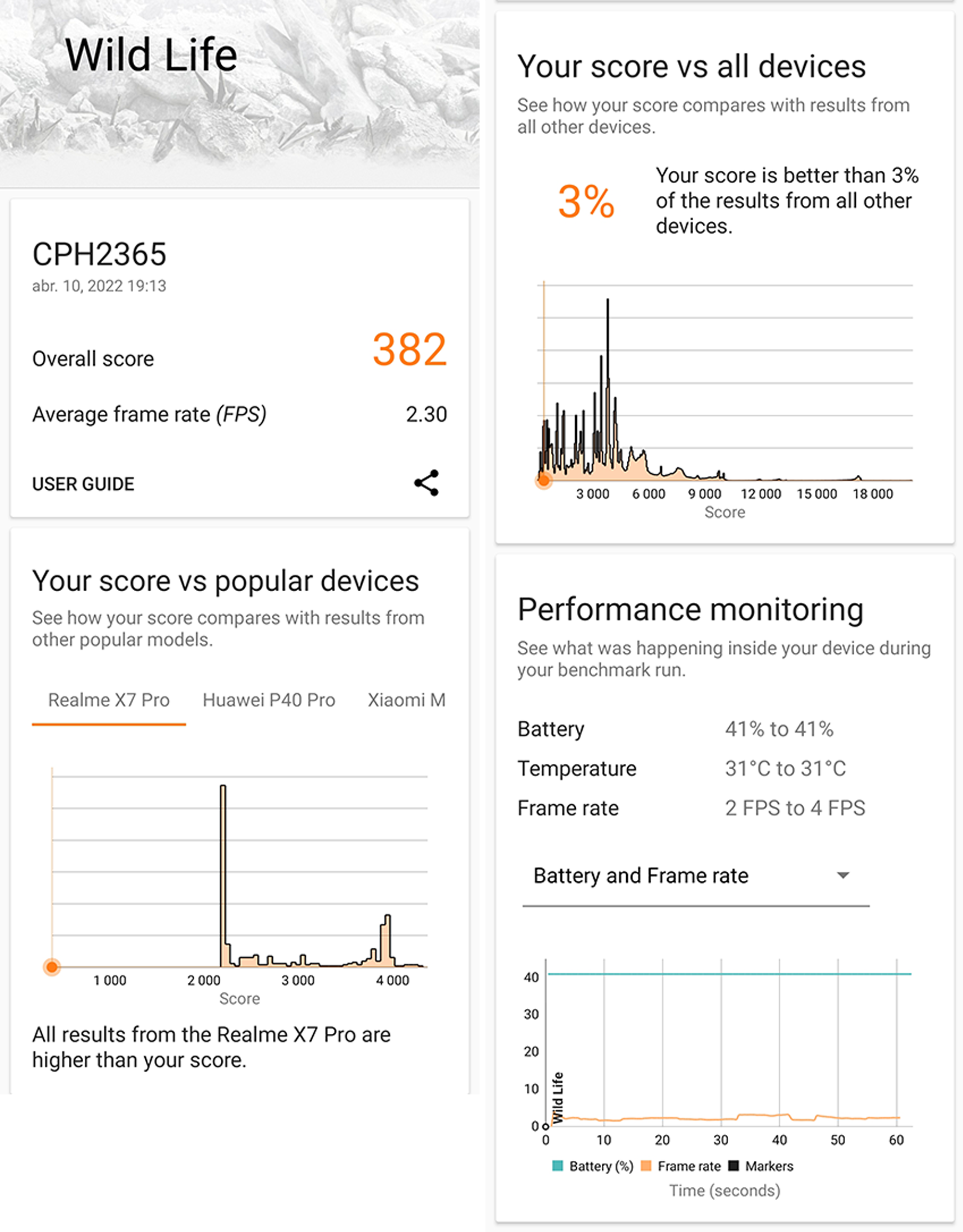 Nos encontramos con el que es, tal vez, el aspecto menos destacable del Reno6 Lite y es su rendimiento. El dispositivo cuenta con Snapdragon 662, con una memoria RAM de 6GB, que puede incrementarse a 8GB. Esto lo convierte en un gama media por debajo de dispositivos como la línea Redmi, tal como lo reflejan los Benchmarks con lo cual lo hemos probado, pero que debería mover una gran mayoría de apps y juegos sin problemas, lo cual lo hace a medias.