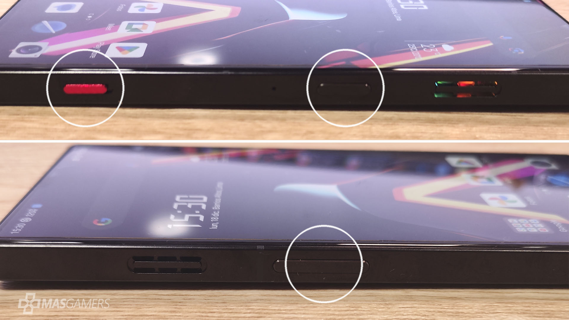 Contaremos con varios botones dentro el equipo, pero cada uno con una dedicada y útil función, empezando por los clásicos botones de subir y bajar volumen, que estarán en el lado izquierdo, mientras que en el lado derecho tenemos el botón de encendido y bloqueo, además de un botón extra de color rojo que no llevará al centro de comando para el modo de juego, y además botones táctiles en los extremos que funcionan como gatillos para poder programarlos en nuestros juegos