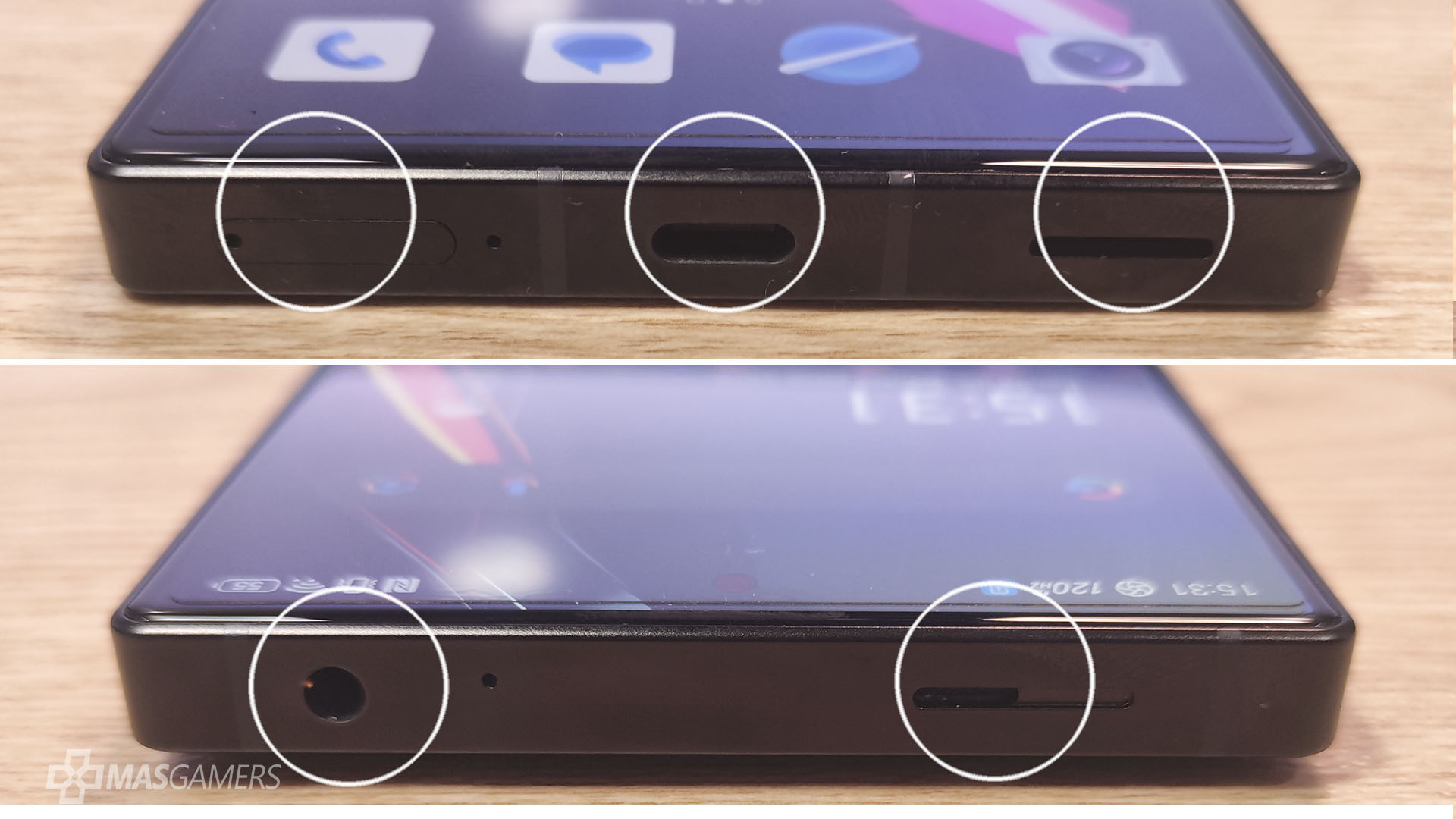 En la parte inferior, se encuentra la bandeja para tarjetas SIM, junto con el puerto USB-C y uno de los altavoces, y en la parte superior contaremos con el otro altavoz y además con una entrada Jack para audífonos, lo cual se agradece mucho ya que actualmente muchos equipos han suprimido esta entrada, pero aun lo encontramos en el RedMagic 8S Pro.