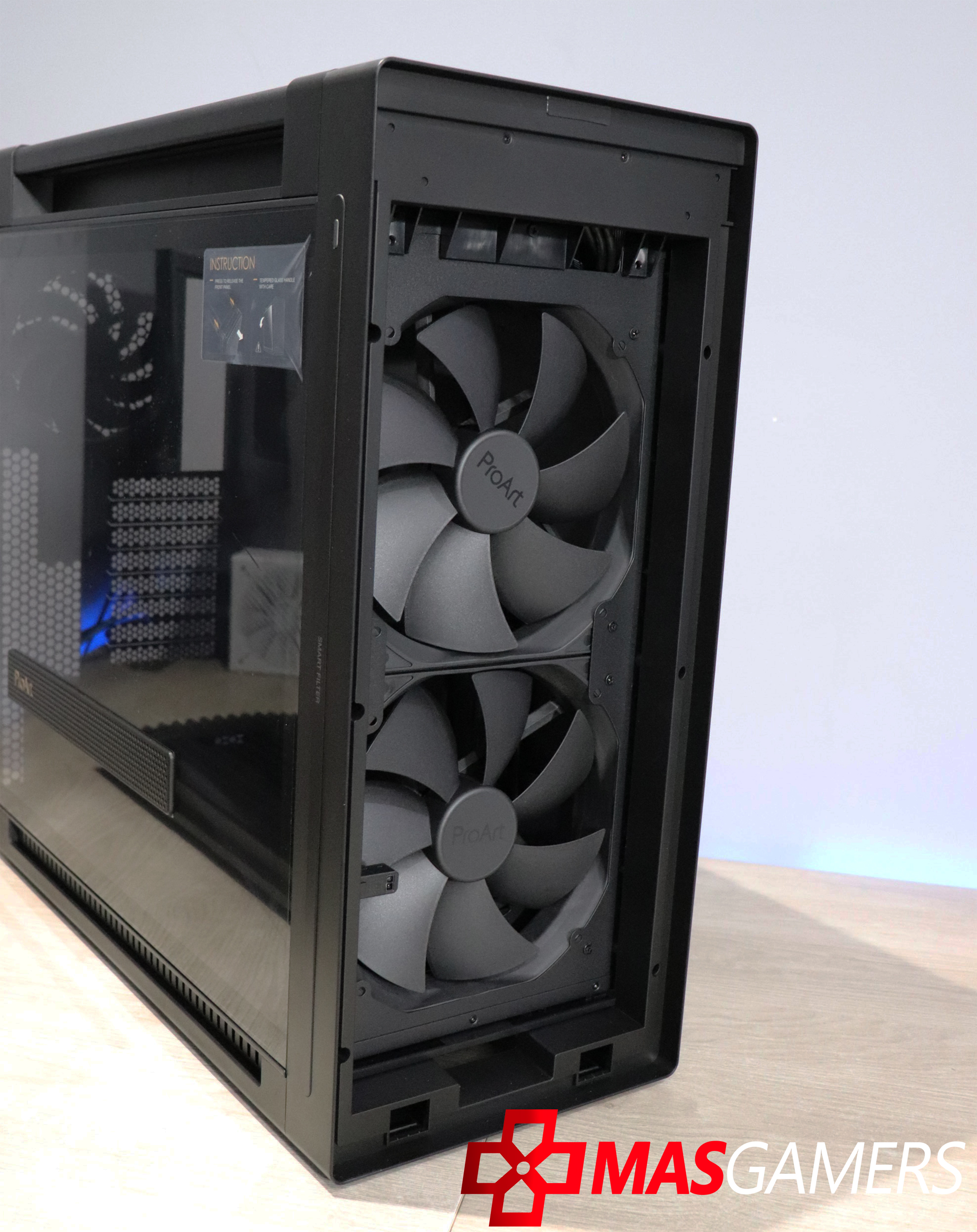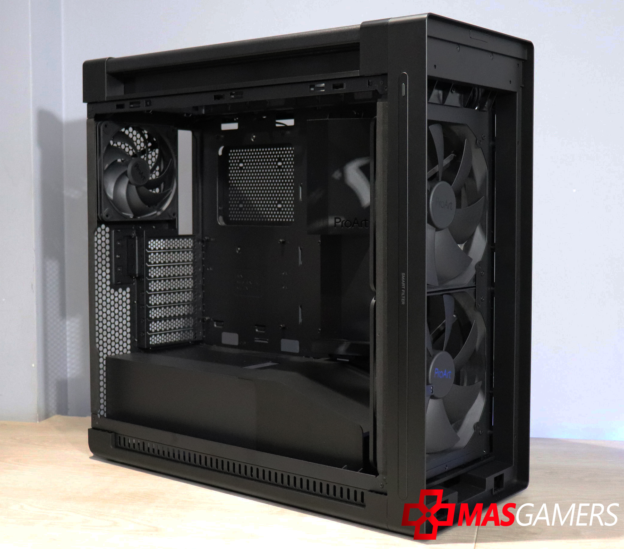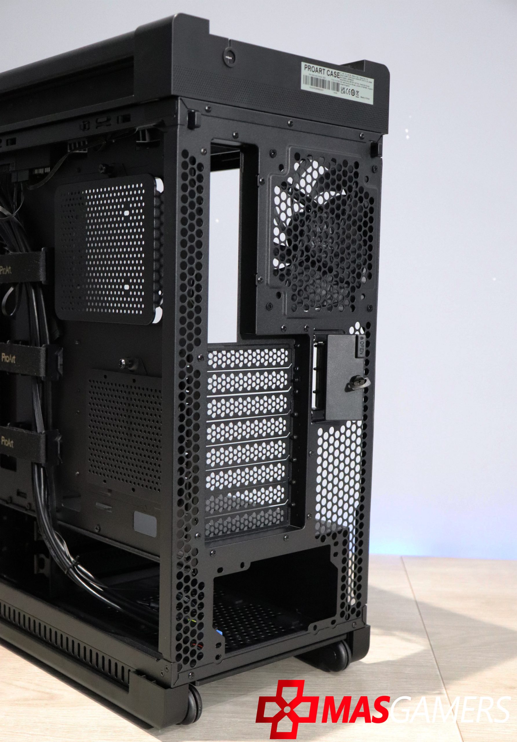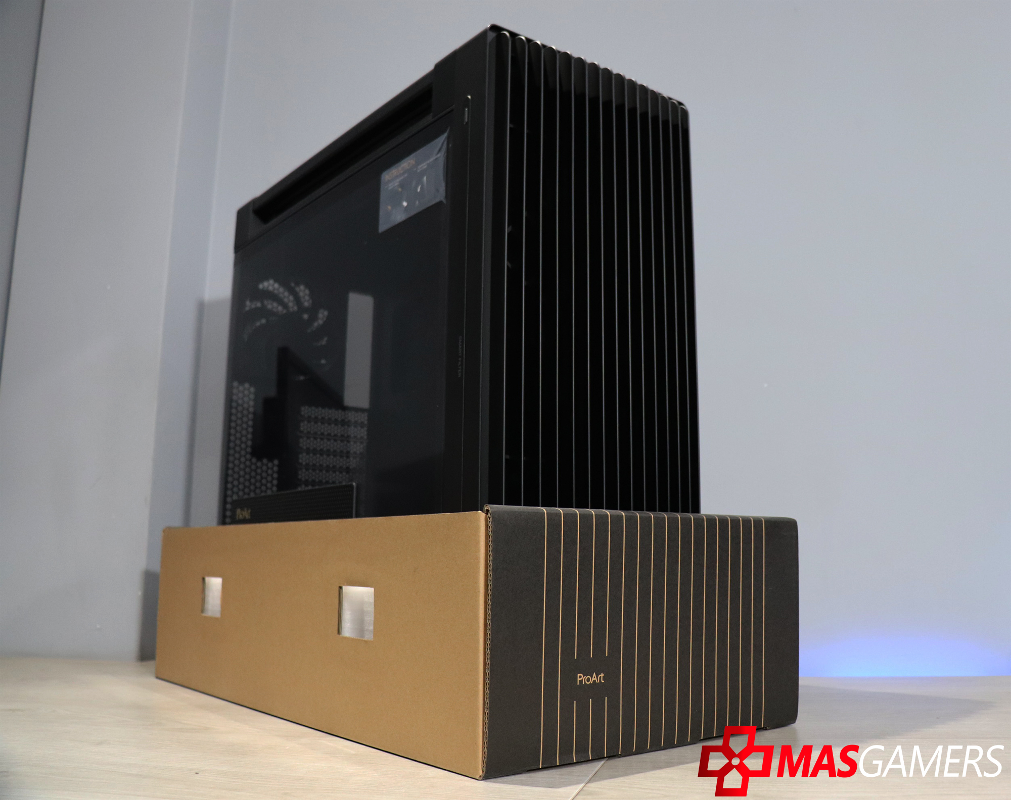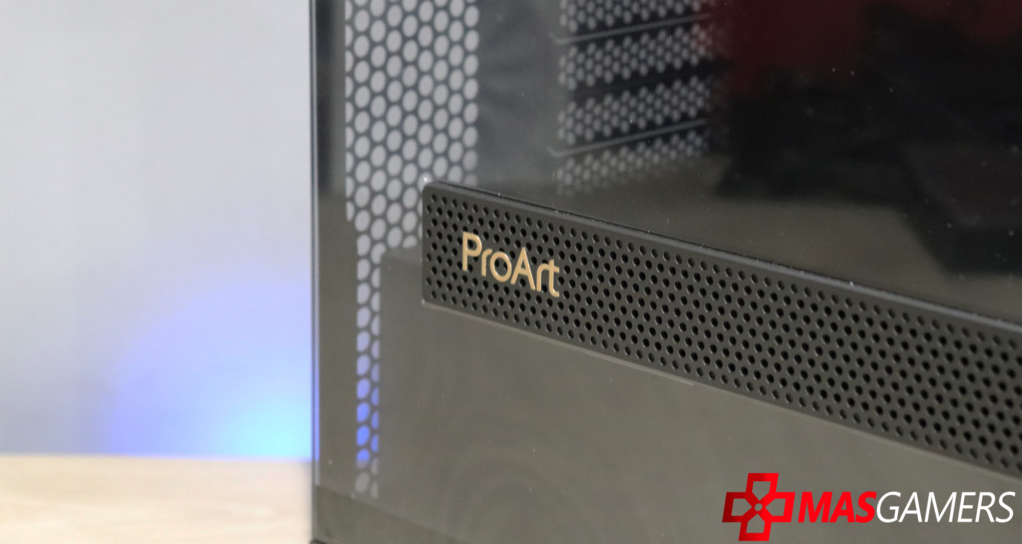 En la parte lateral aparte de un vidrio grande que nos permite una vista clara del interior, también encontramos una ventila lateral que permite una entrada de aire directa para la GPU y también como vemos tiene el logo de ProArt.