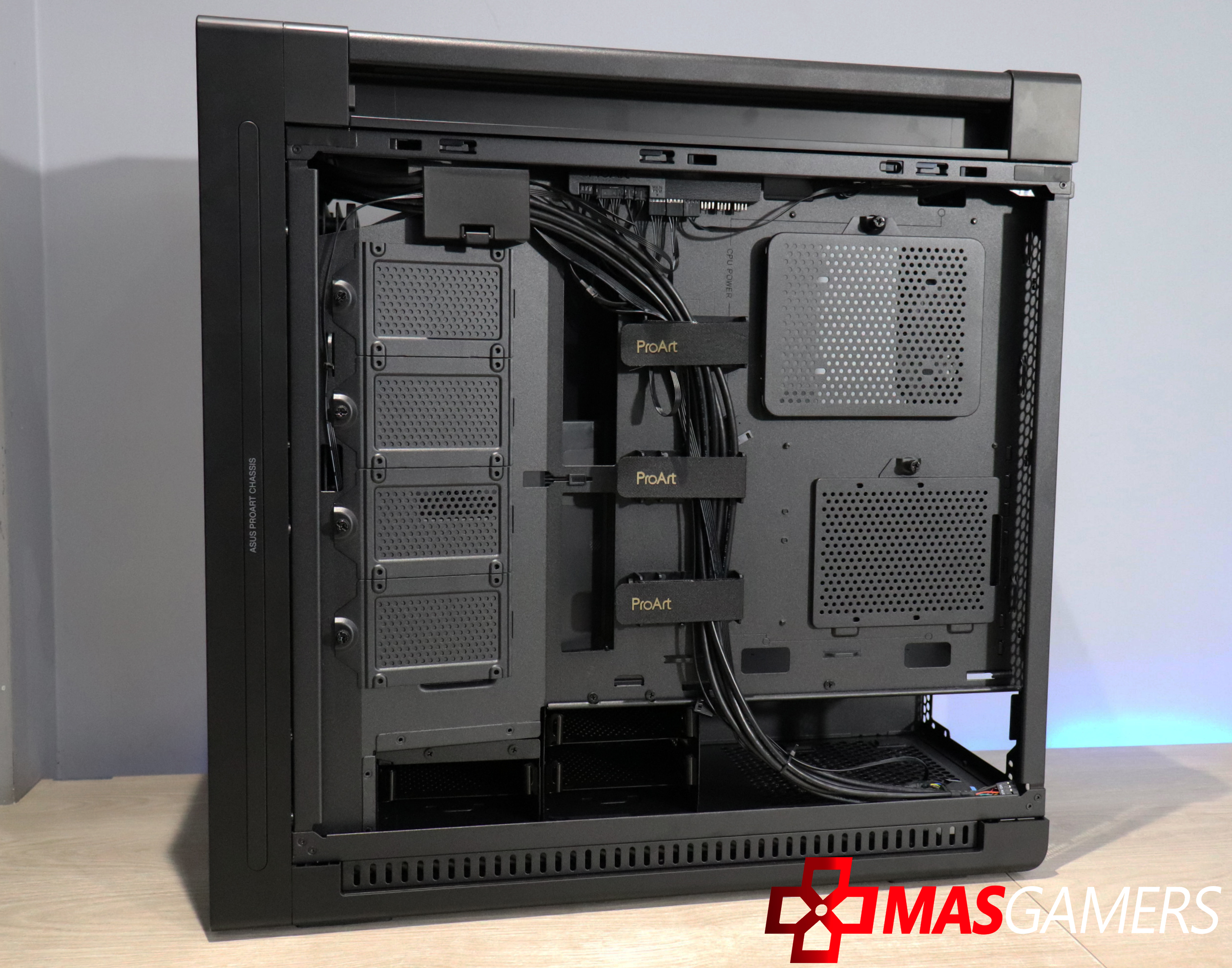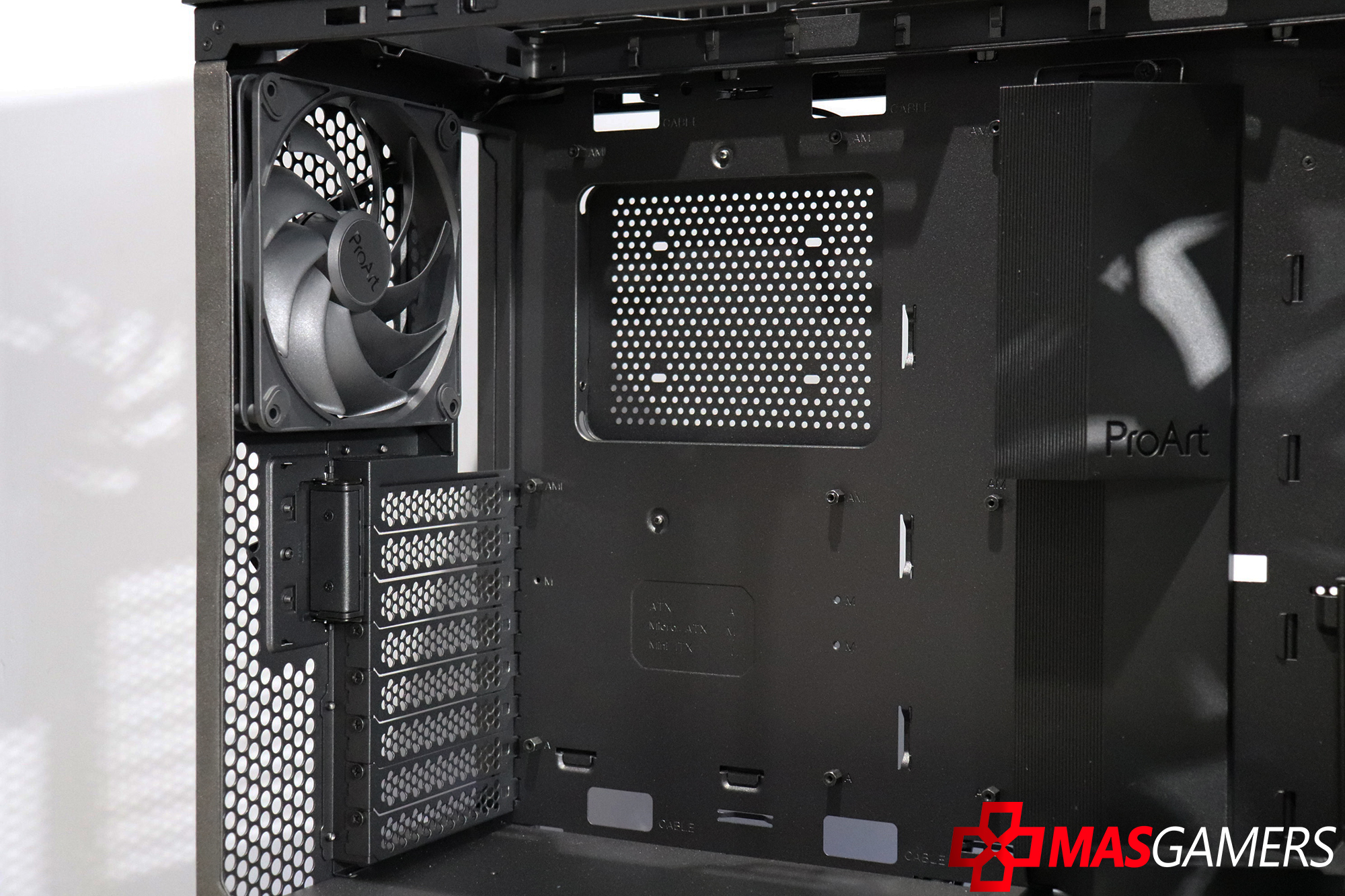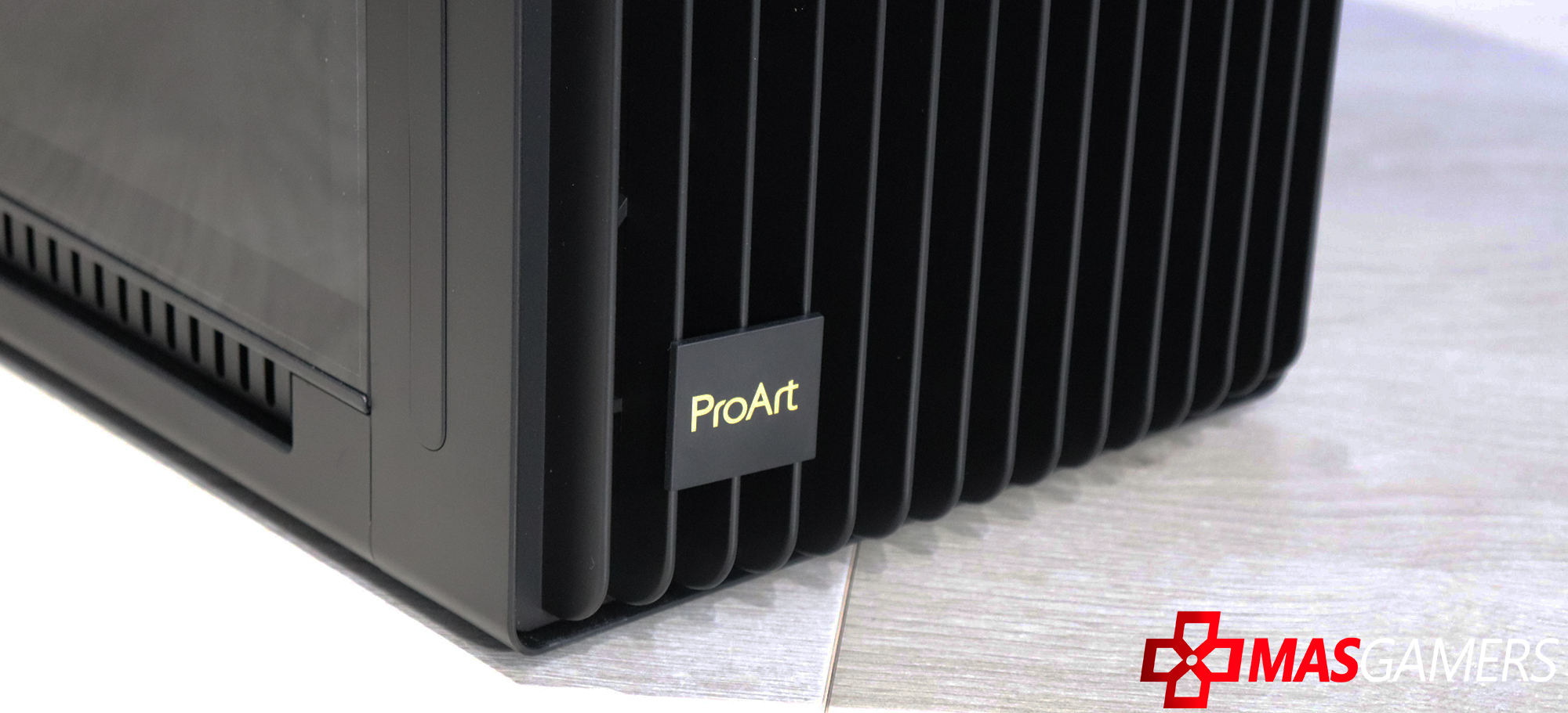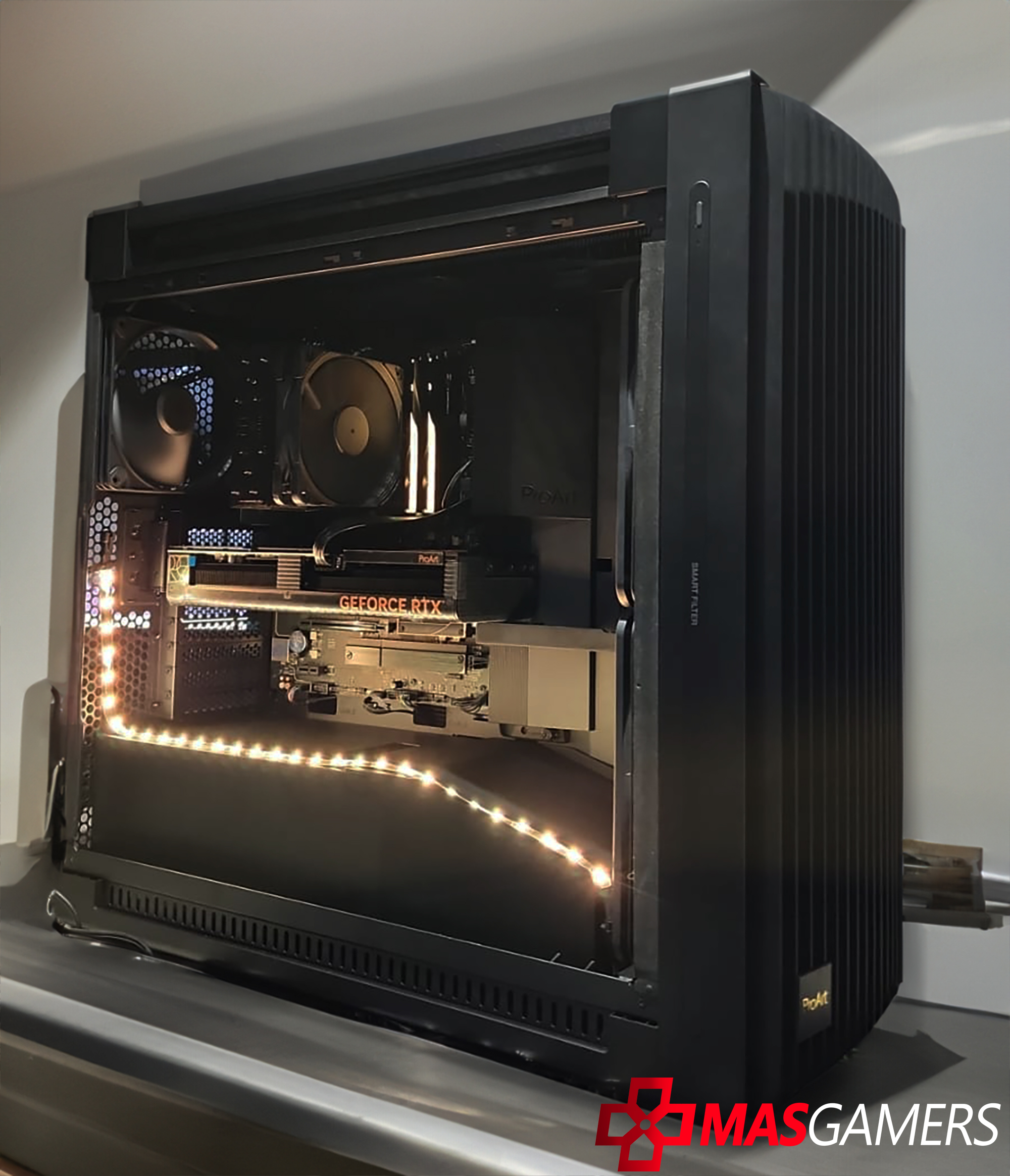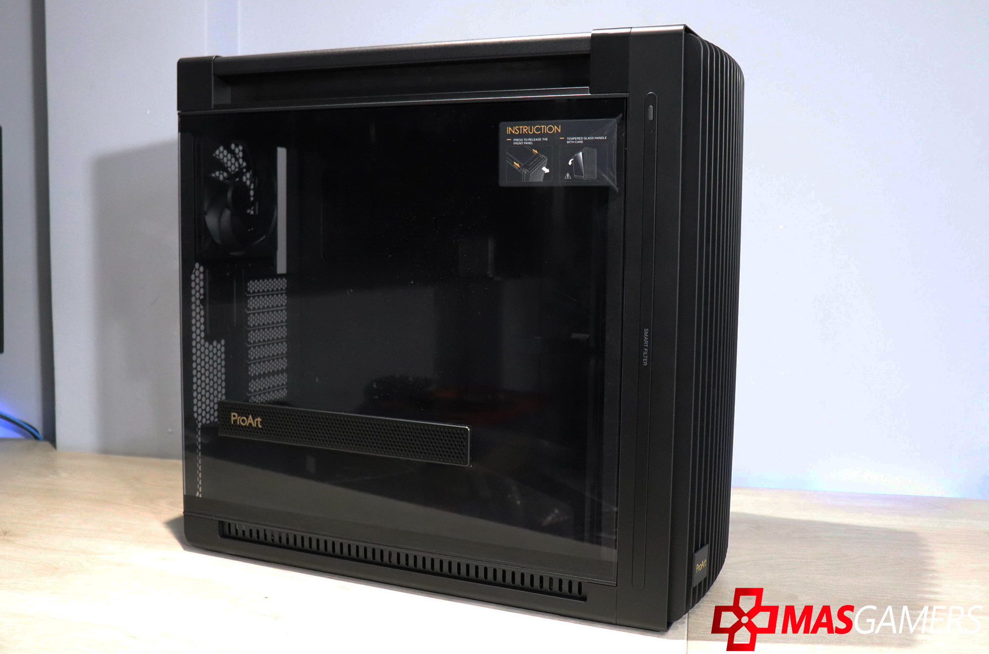 En la parte lateral aparte de un vidrio grande que nos permite una vista clara del interior, también encontramos una ventila lateral que permite una entrada de aire directa para la GPU y también como vemos tiene el logo de ProArt.