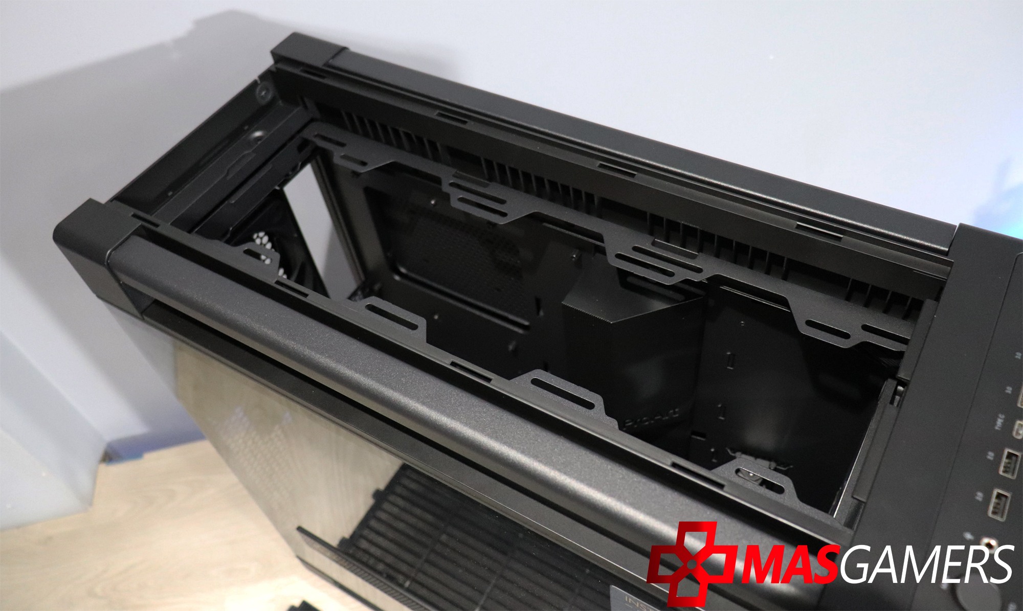 La zona superior es nuestra baza para instalar elementos de refrigeración líquida y ventiladores estándar. La cubierta cuenta con un raíl en posición intermedia, con 34 mm de espacio exterior y 30 mm interior, debiendo separar radiador y ventiladores para su instalación. Y en la parte posterior podemos colocar la antena para poder tener todo asegurado.